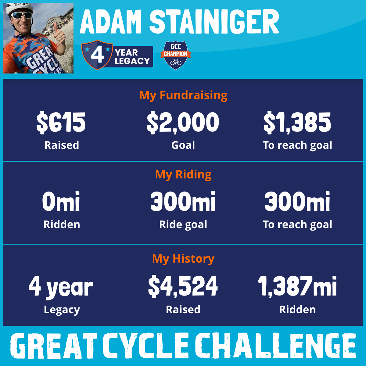 My goal is to pedal 300 miles throughout the month of September. I am doing this fundraiser because cancer is the largest killer of children from disease in the United States – 38 children die of cancer every week. I lost my mother to stomach cancer and I had a total gastrectomy due to precancerous polyp growths and risk of reoccurrence, so cancer is close to home.