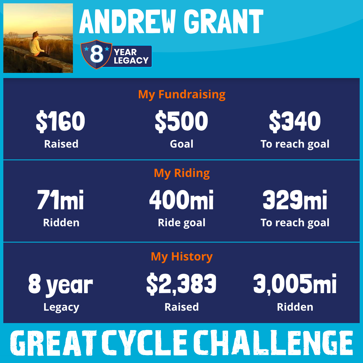 I am riding 400 mi in memory of Sean. Please sponsor me and support my challenge to fight kids' cancer and save little lives.