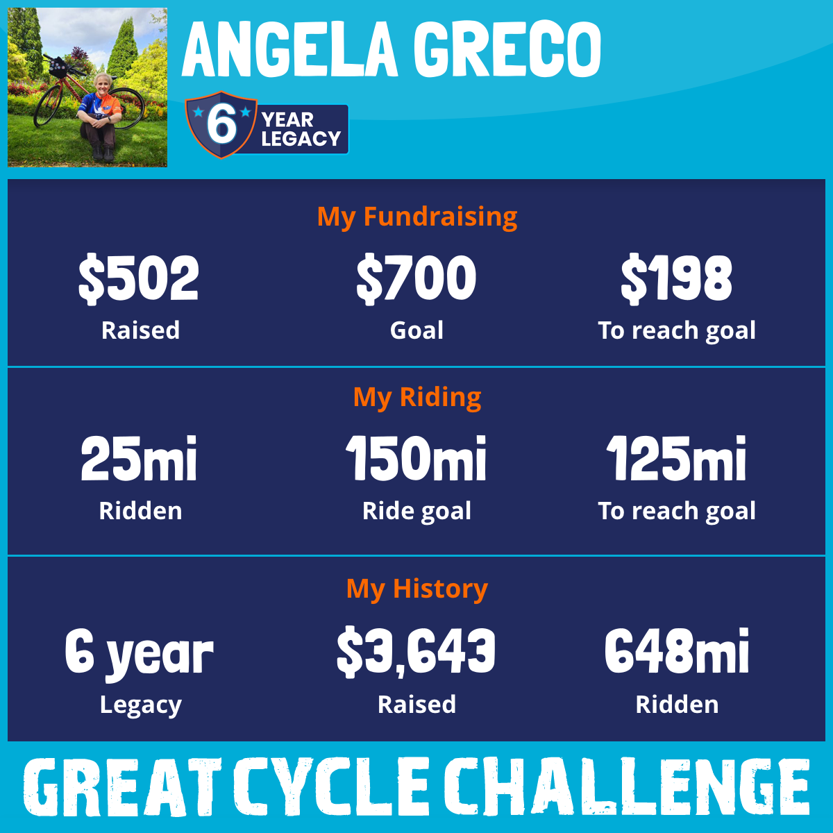 This is my 5th year participating in the Great Cycle Challenge. As the years continue, this event has become more and more important to me for many reasons. It is a cause that is close to my heart and continues to inspire me in ways I can't predict. It breaks my heart that anyone, especially children, has to go through fighting cancer when they should be living life and looking forward to their future! Finding a cure is so very important when this disease is impacting so many people and families!