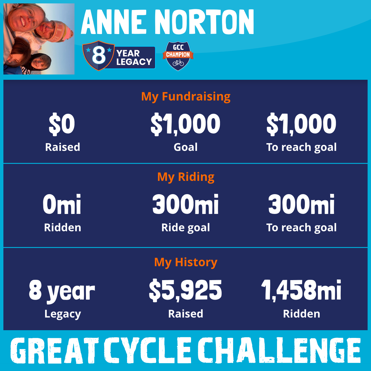 I am riding 300 mi in memory of my aunty, Carolyn and Arlene Reser. Please sponsor me and support my challenge to fight kids' cancer and save little lives.
