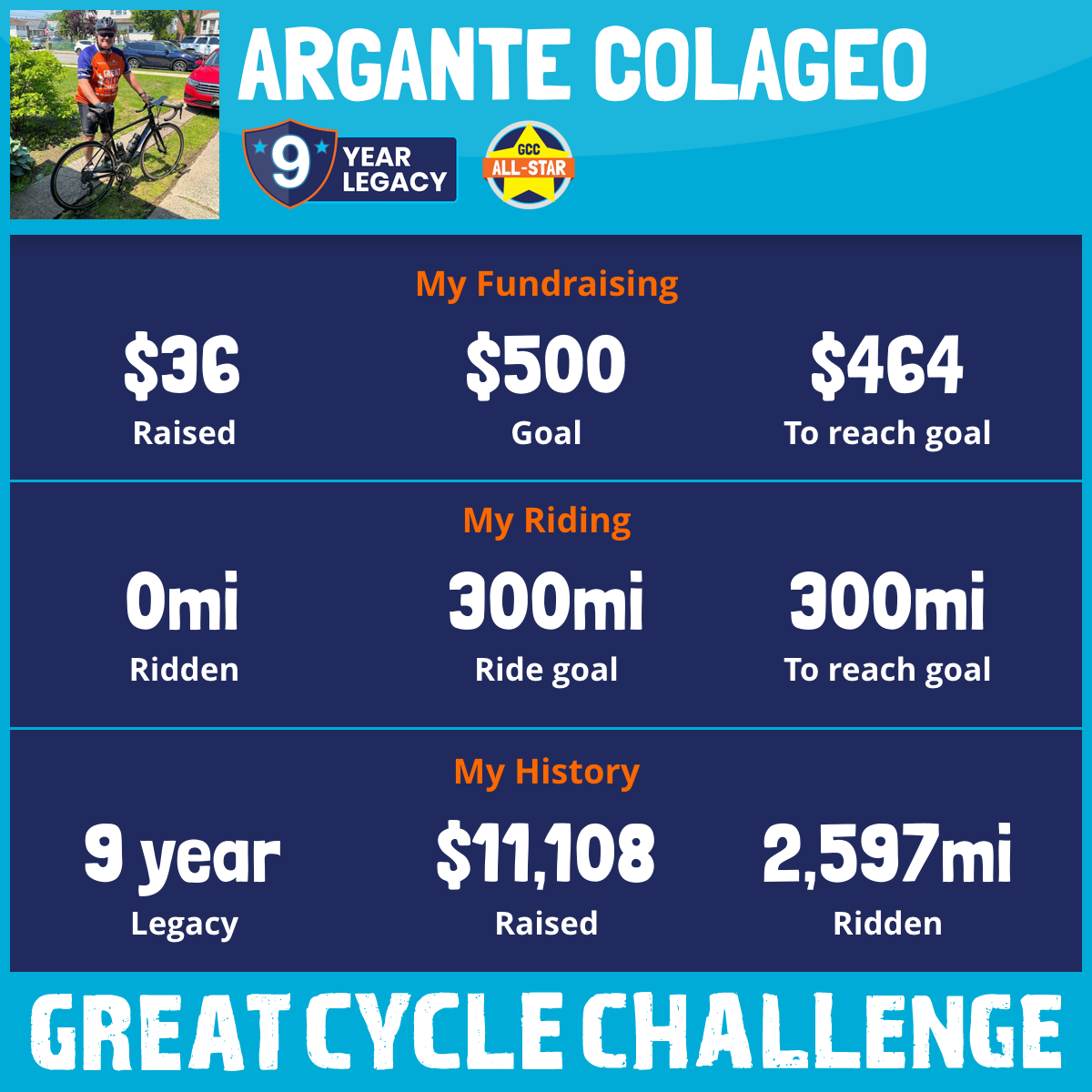 This is my fifth year in the Great Cycle Challenge to fight kids cancer. I will be riding at least 500 miles (805 km) this September to raise funds to continue the fight. I hope you will join me in this effort and make a donation of whatever amount you can. Every donation, no matter how much it is, helps.
