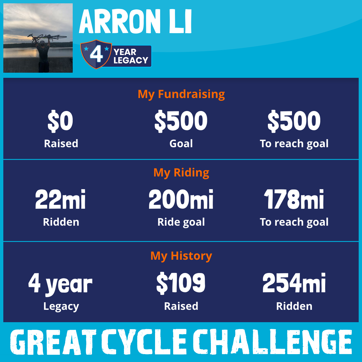 I am riding 200 mi in memory of Andy Li. Please sponsor me and support my challenge to fight kids' cancer and save little lives.