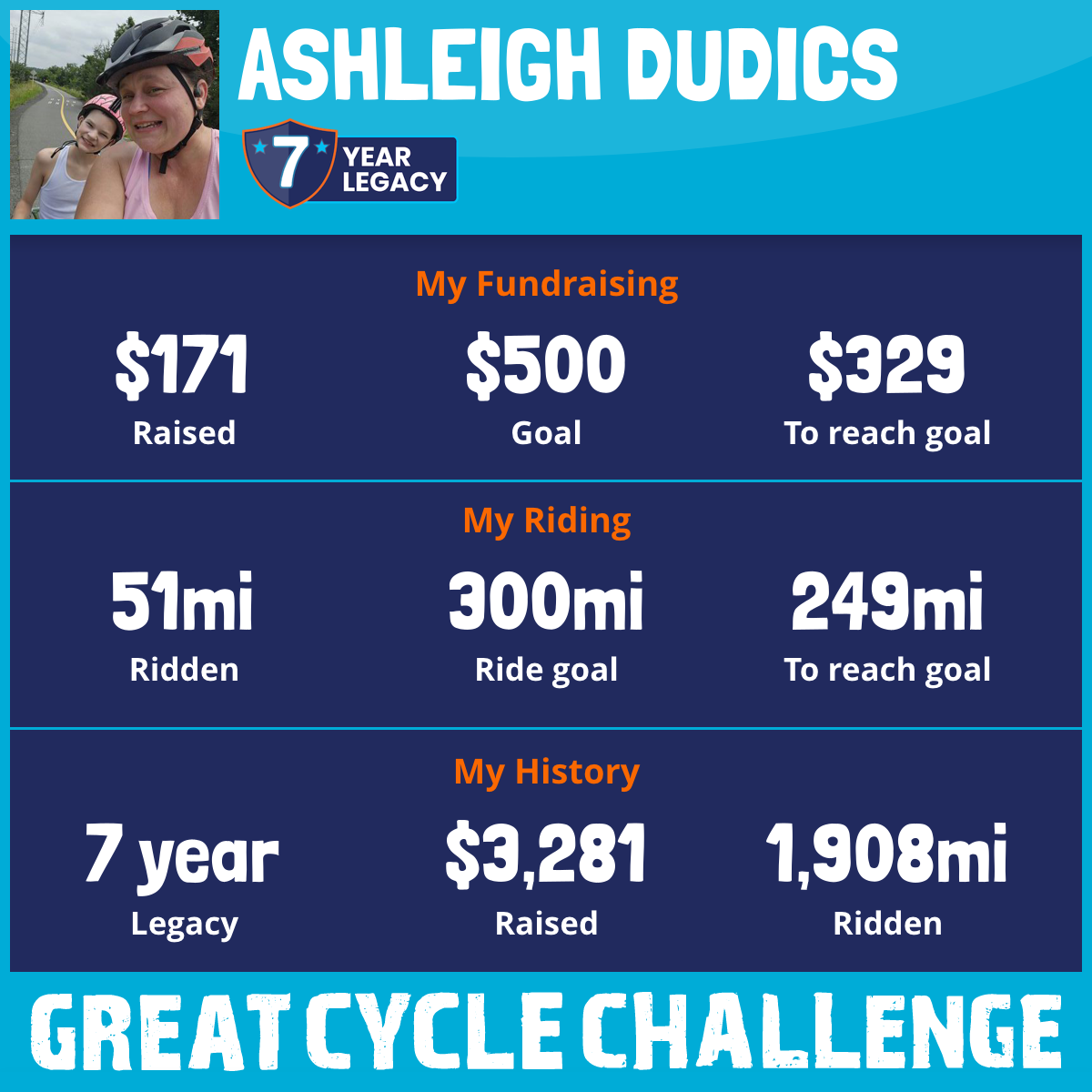 August 29th will mark 19 years since my daughters death. I've donated through out those years in hope. Hope that one more child wouldn't suffer. One more child wouldn't die and so one more family wouldn't have to live through what I lived through. This will be my seventh year riding. In the last 7 years years ive raised over three thousand dollars. This year I've raised my miles in hope that if I do the hard part you'll donate. So in this time of uncertainty if you can, please donate. If you can't please don't feel bad. I'll still ride just share. Thanks for helping me kick cancers butt.