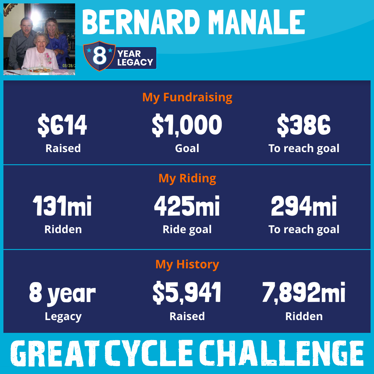I am riding 425 mi in memory of Cindy Manale McGlone Miller. Please sponsor me and support my challenge to fight kids' cancer and save little lives.