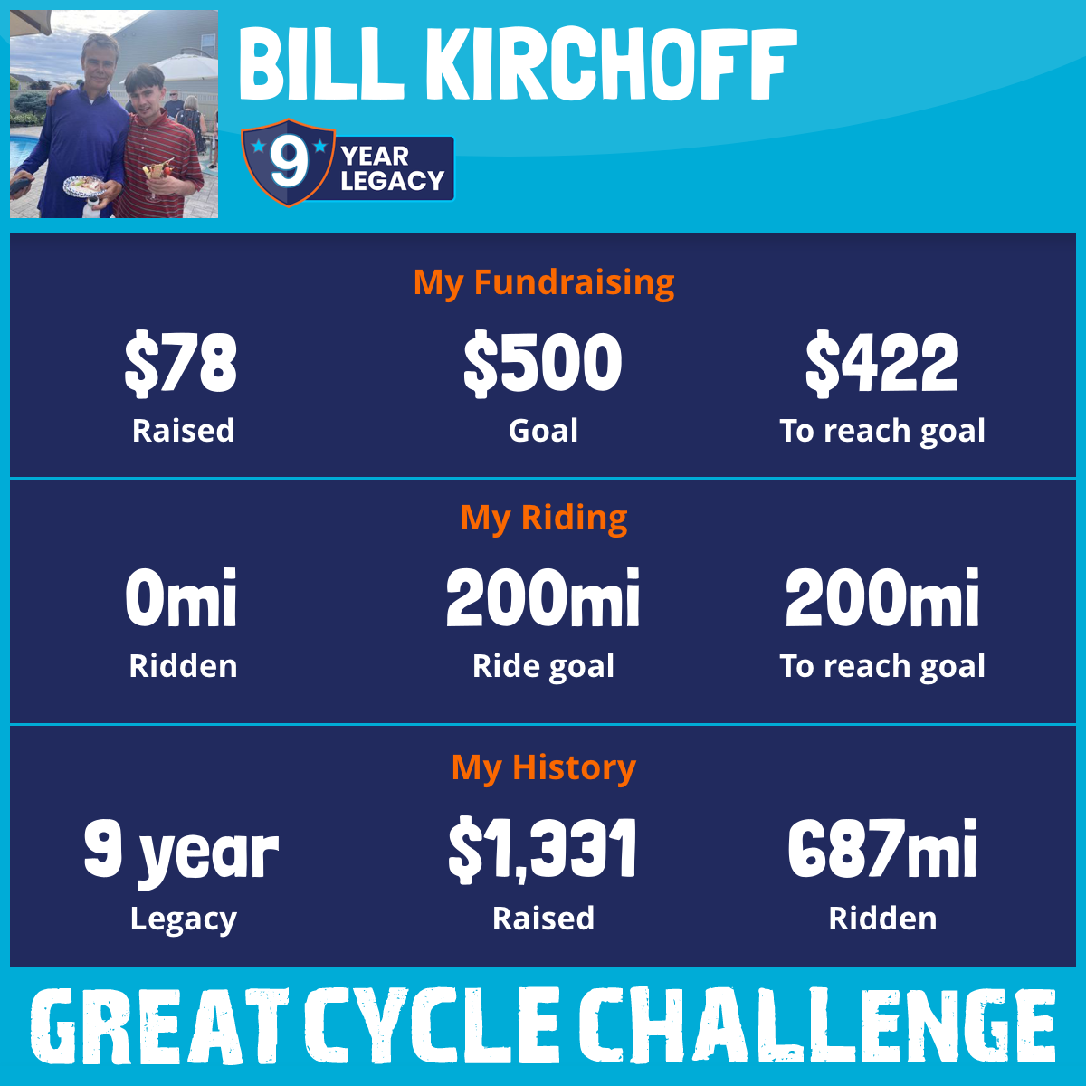 I am riding 200 mi for my friend, bill Kirchoff. Please sponsor me and support my challenge to fight kids' cancer and save little lives.
