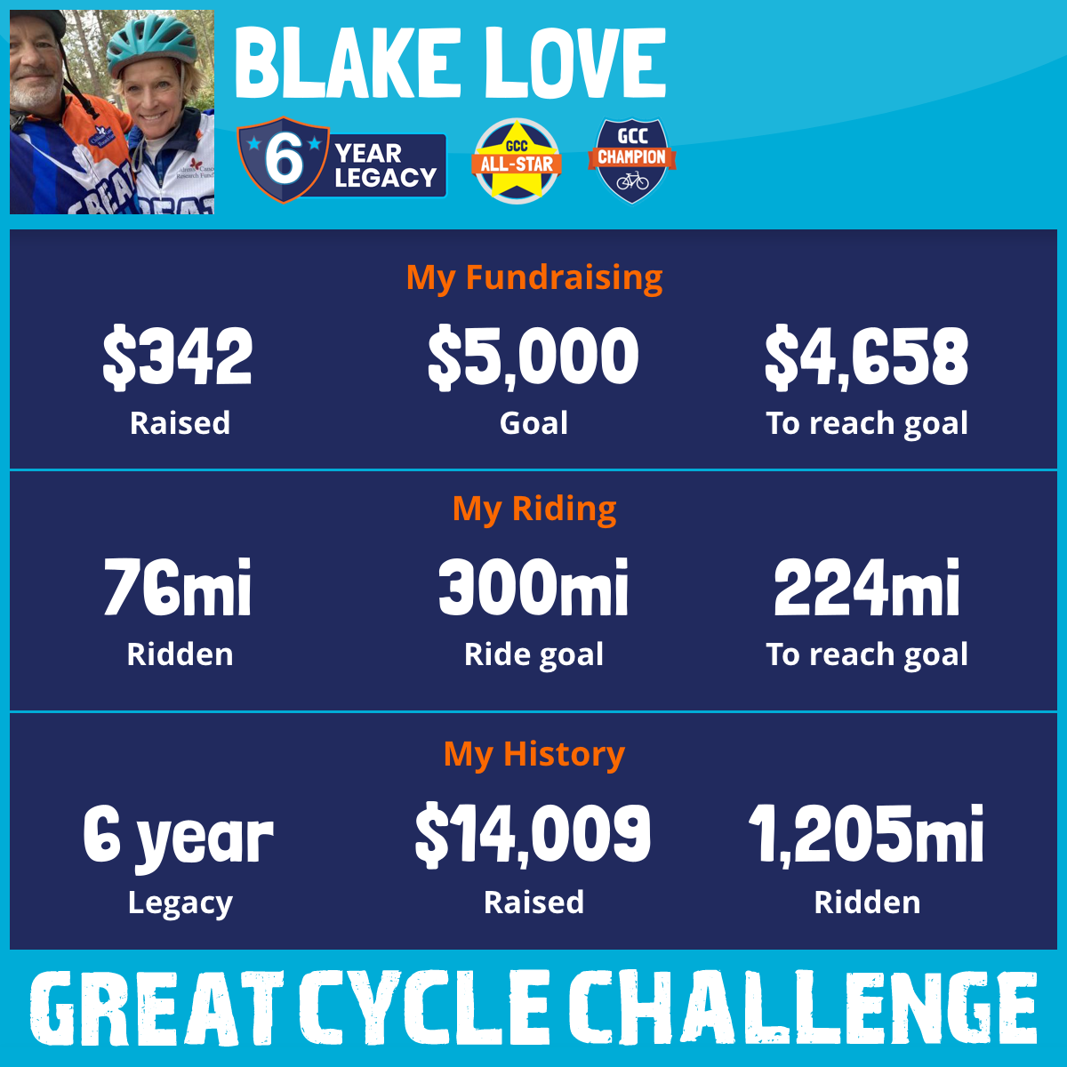 This September, I am taking part in the Great Cycle Challenge to fight kids' cancer! This is my 6th year of participating and I have increased my goal to 300 miles with Kathy's help and increased my goal to raise $5000.00 with your help.