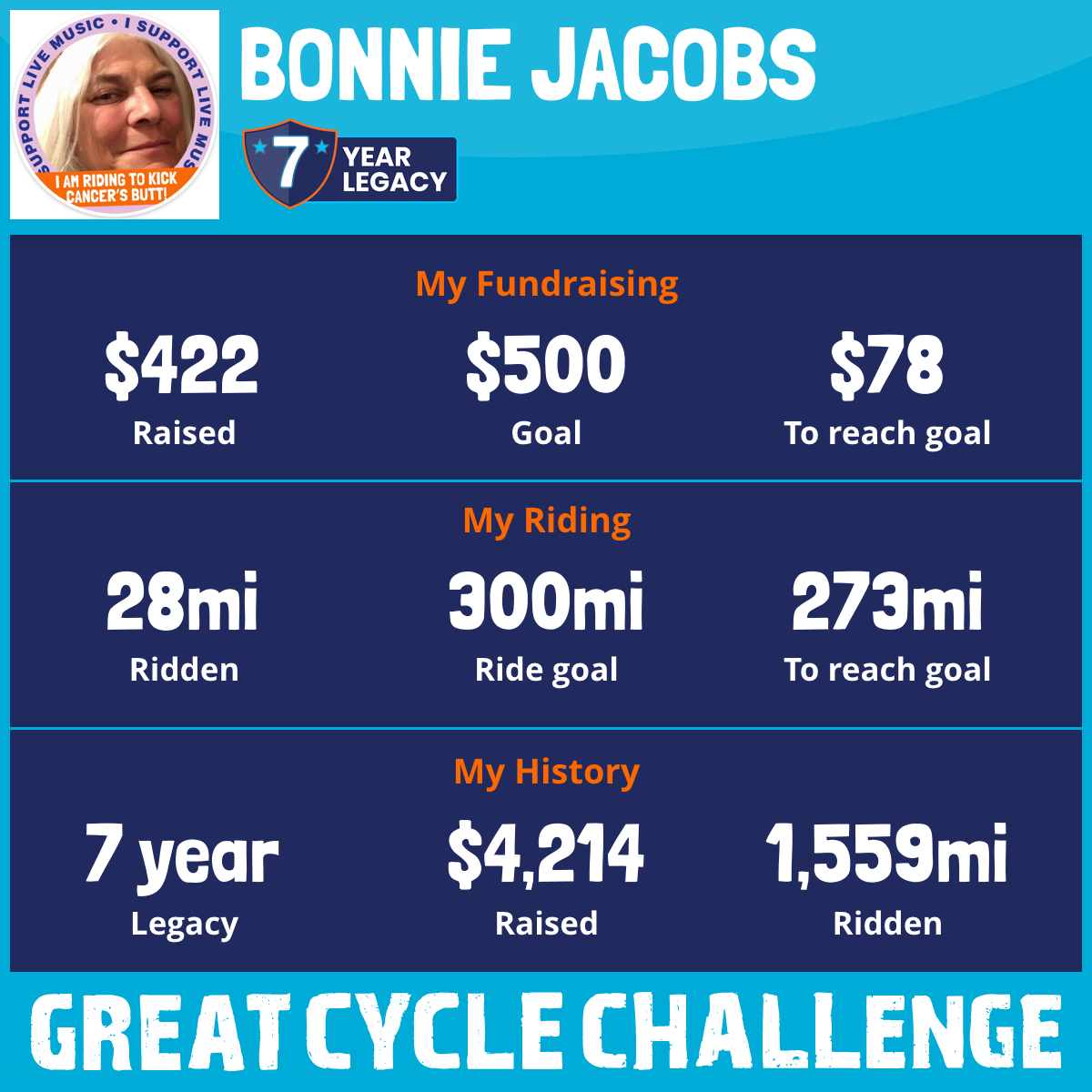 The Fund Raising Page will be open until October 31. To make a donation, view my fundraising page: www.greatcyclechallenge.com/Riders/BonnieJacobs or go to my FB fundraising page.