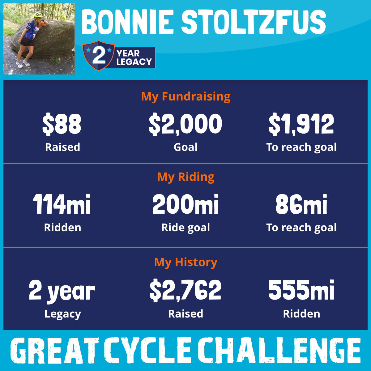 As a 3 year cancer survivor, I understand the emotions following a cancer diagnosis. Cycling has become a beneficial stress reliever and adventure as I pedal the back roads of Big Valley or Rail Trails. Therefore, this cycling challenge has resonated within me. So for the second year, this September, I am taking part in the Great Cycle Challenge to fight kids' cancer!