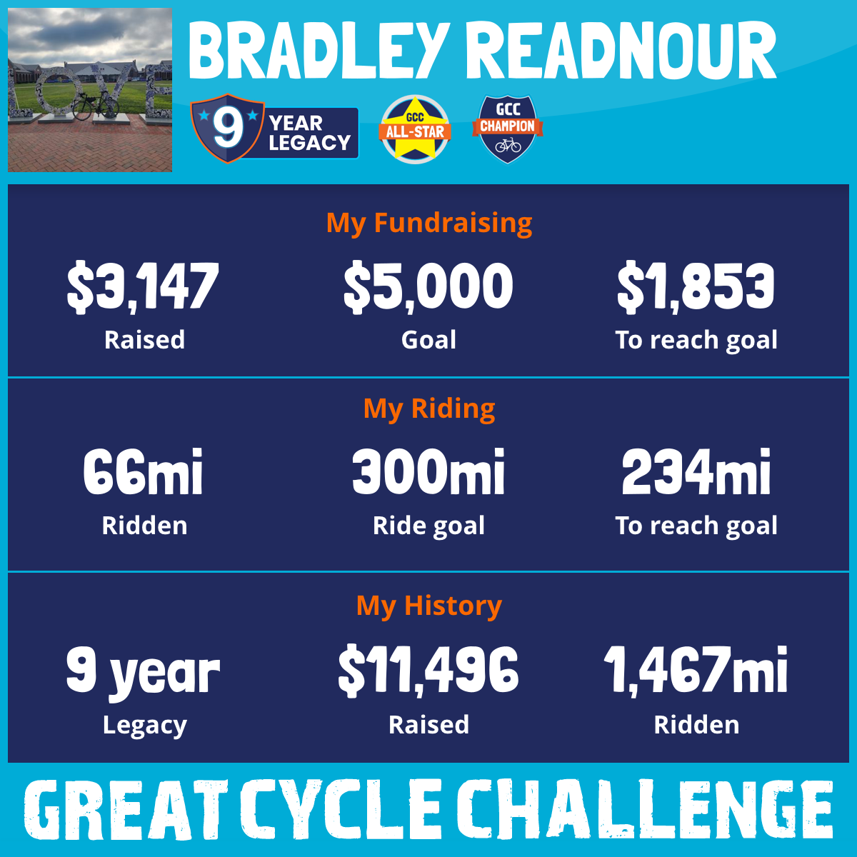 This September I am taking part in the Great Cycle Challenge to fight kids' cancer! Last year with your help, we raised $2,783 for this charity. I was also able to overcome my previous year's ankle injury and ride 236 miles! This year I am going to try and ride 300 miles and raise $5,000. I am very thankful for all my supporters do here.