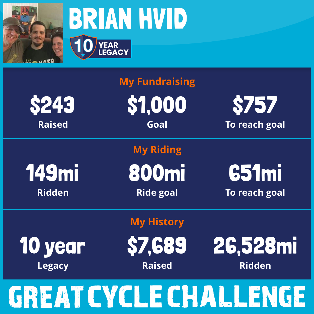I am riding 800 mi in memory of Dean N Hvid. Please sponsor me and support my challenge to fight kids' cancer and save little lives.