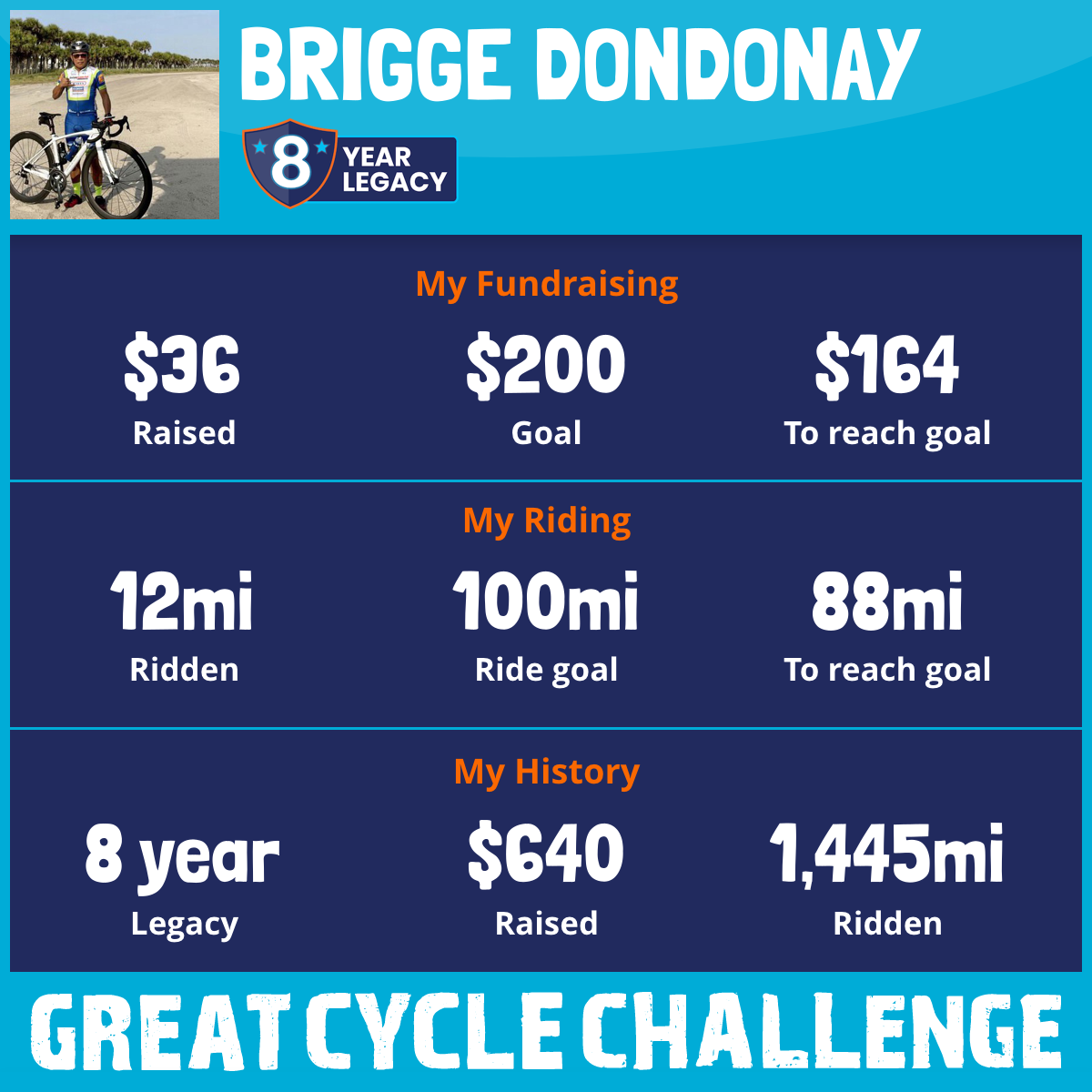 I am riding 100 mi in memory of Bing Dondonay. Please sponsor me and support my challenge to fight kids' cancer and save little lives.