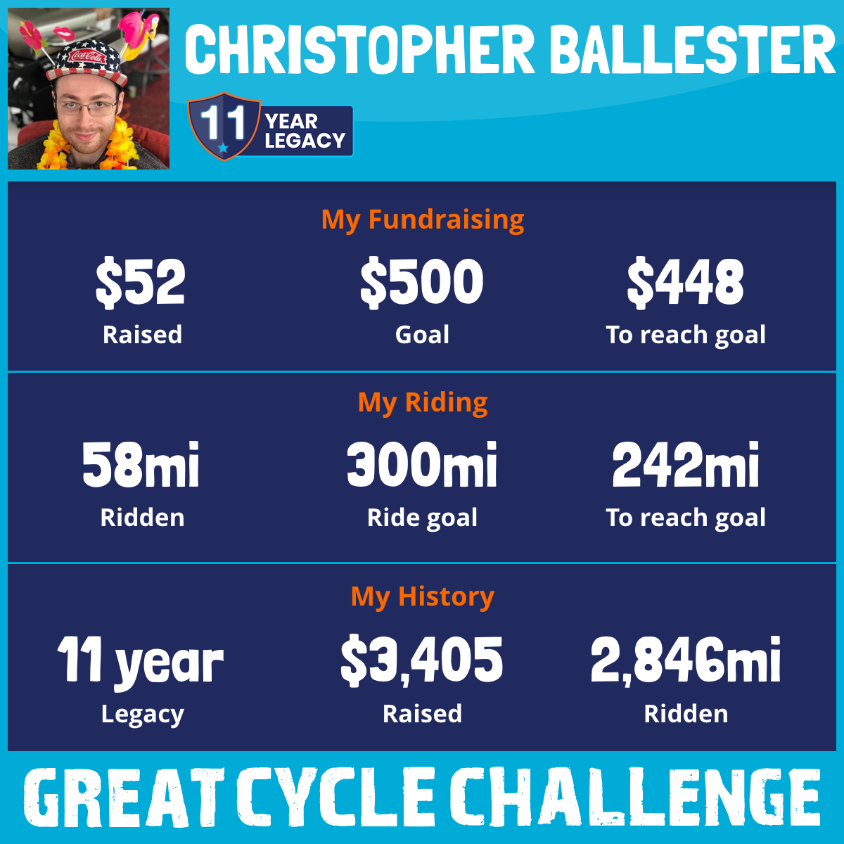 I am riding 300 mi for My future brother in law, and Jean Ballester. Please sponsor me and support my challenge to fight kids' cancer and save little lives.