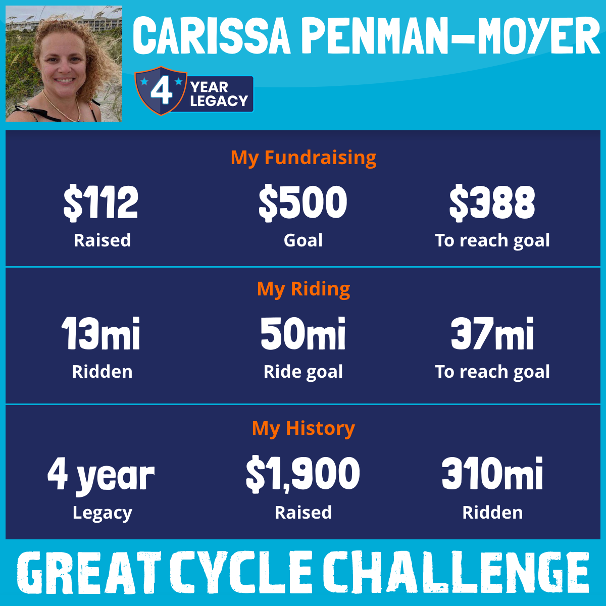 I am choosing to complete the Great Cycle Challenge in memory of my little cousin Catherine. She fought breast cancer very bravely for a few years but unfortunately lost her battle in June of 2019. She was only 26. Throughout her fight she never lost her zest for life, her smile or her contagious laugh! I miss you little cousin! 💗