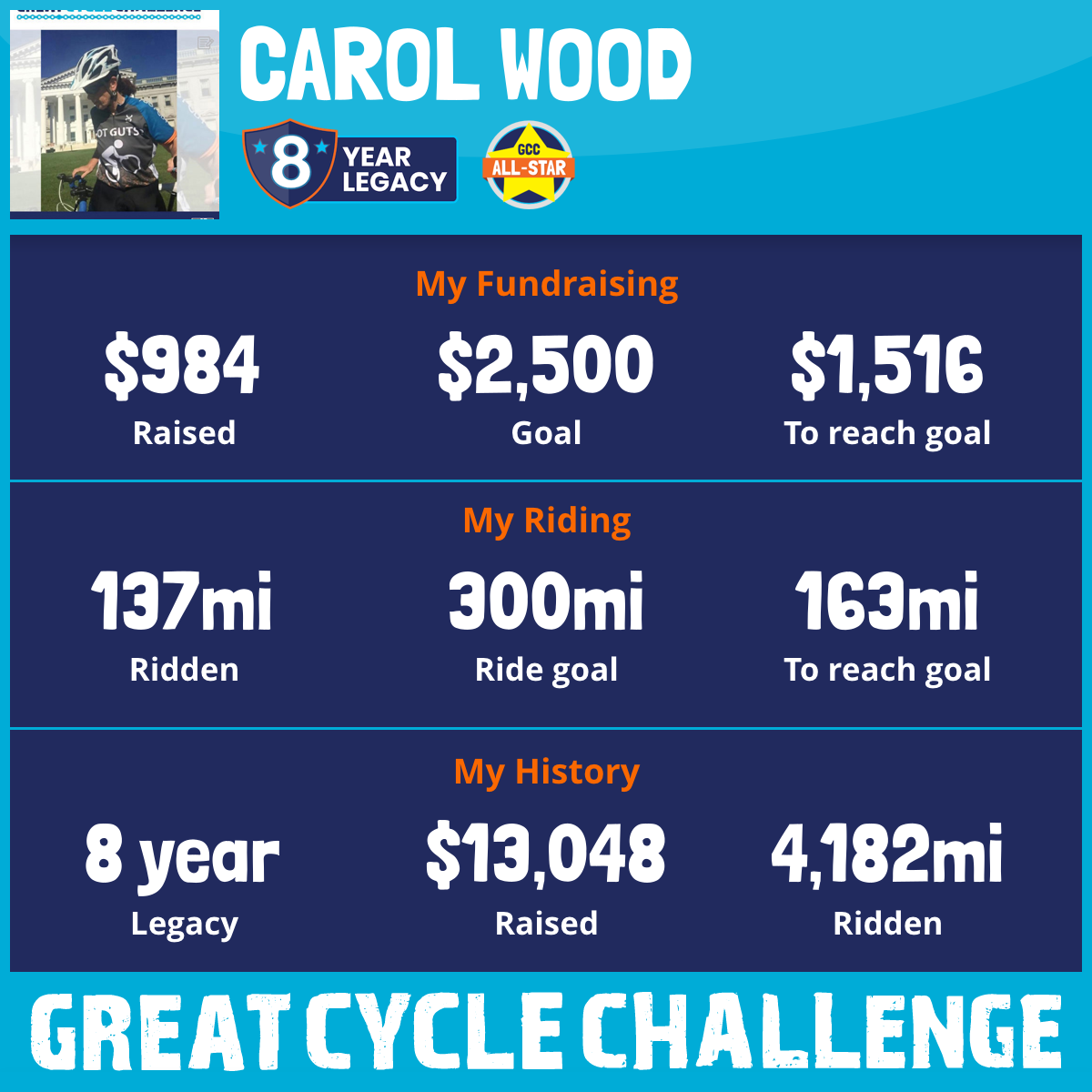 This will be my 8th year riding to continue the fight against this horrible disease. Last year on March 12, 2024 my sister Patty lost her fight with Ovarian Cancer. This year I ride in honor & memory of my sister, determined with your help to eradicate this horrible disease. Your support and encouragement would be greatly appreciated. Thank you in advance 💖 https://greatcyclechallenge.com/Riders/CarolWood1