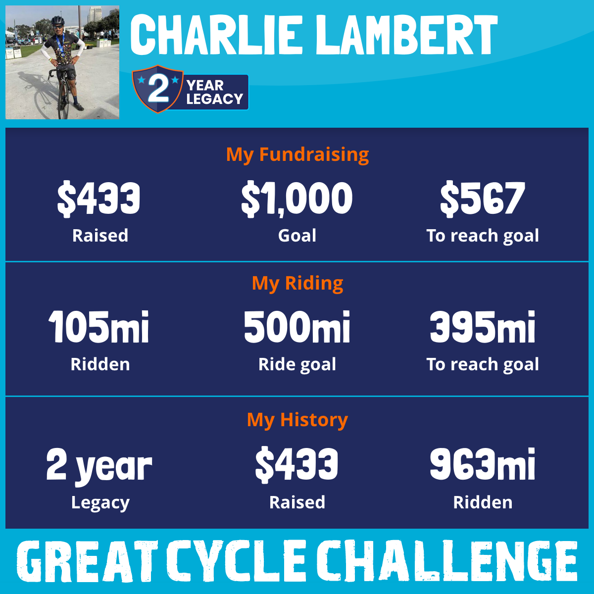 This September, I'm taking on the Great Cycle Challenge - to fight childhood cancer. I will move with a purpose and pledge to ride 500 miles to raise $2,500 to fund research for childhood cancers.