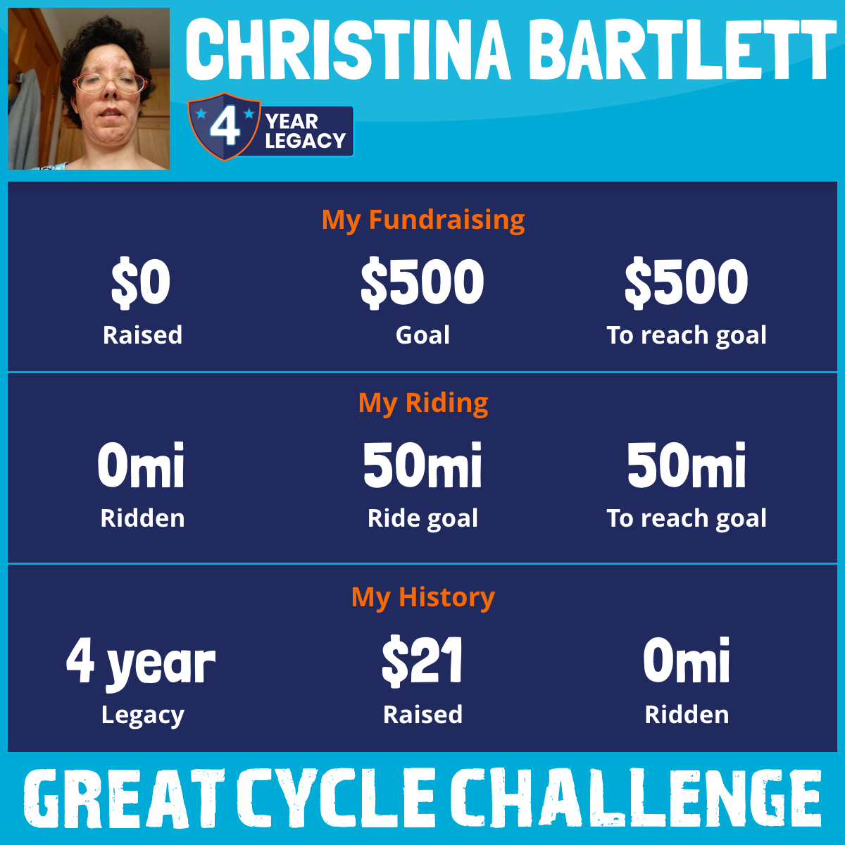 I am riding 50 mi for Andrea. Please sponsor me and support my challenge to fight kids' cancer and save little lives.