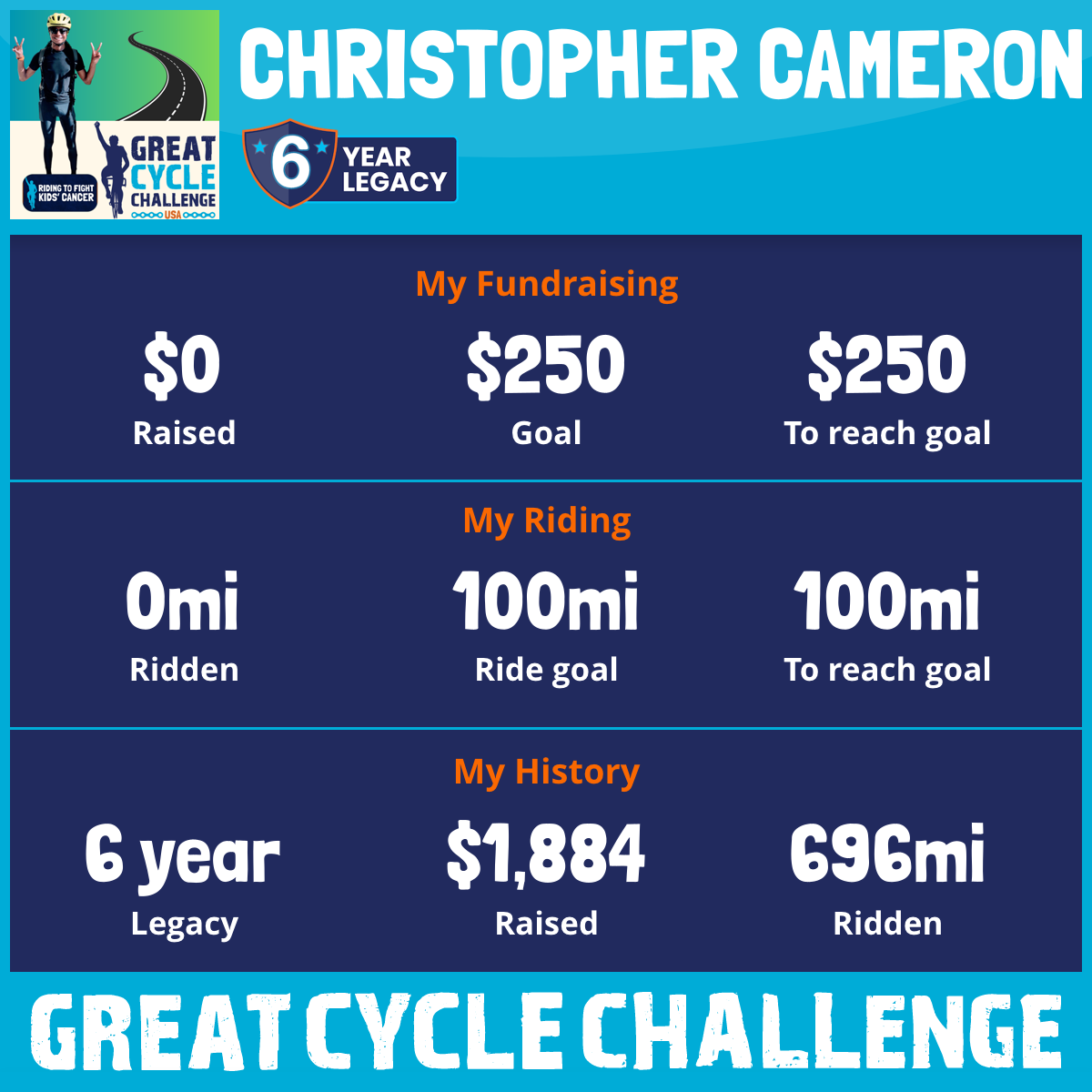 I am riding 100 mi to fight kids' cancer and save little lives. Please sponsor me to support my challenge!
