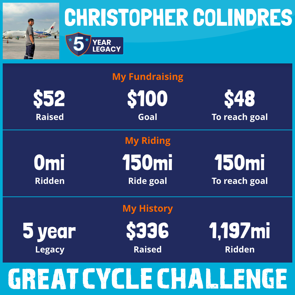 I am riding 150 mi in memory of my son, Christian Lourd G. Colindres. Please sponsor me and support my challenge to fight kids' cancer and save little lives.