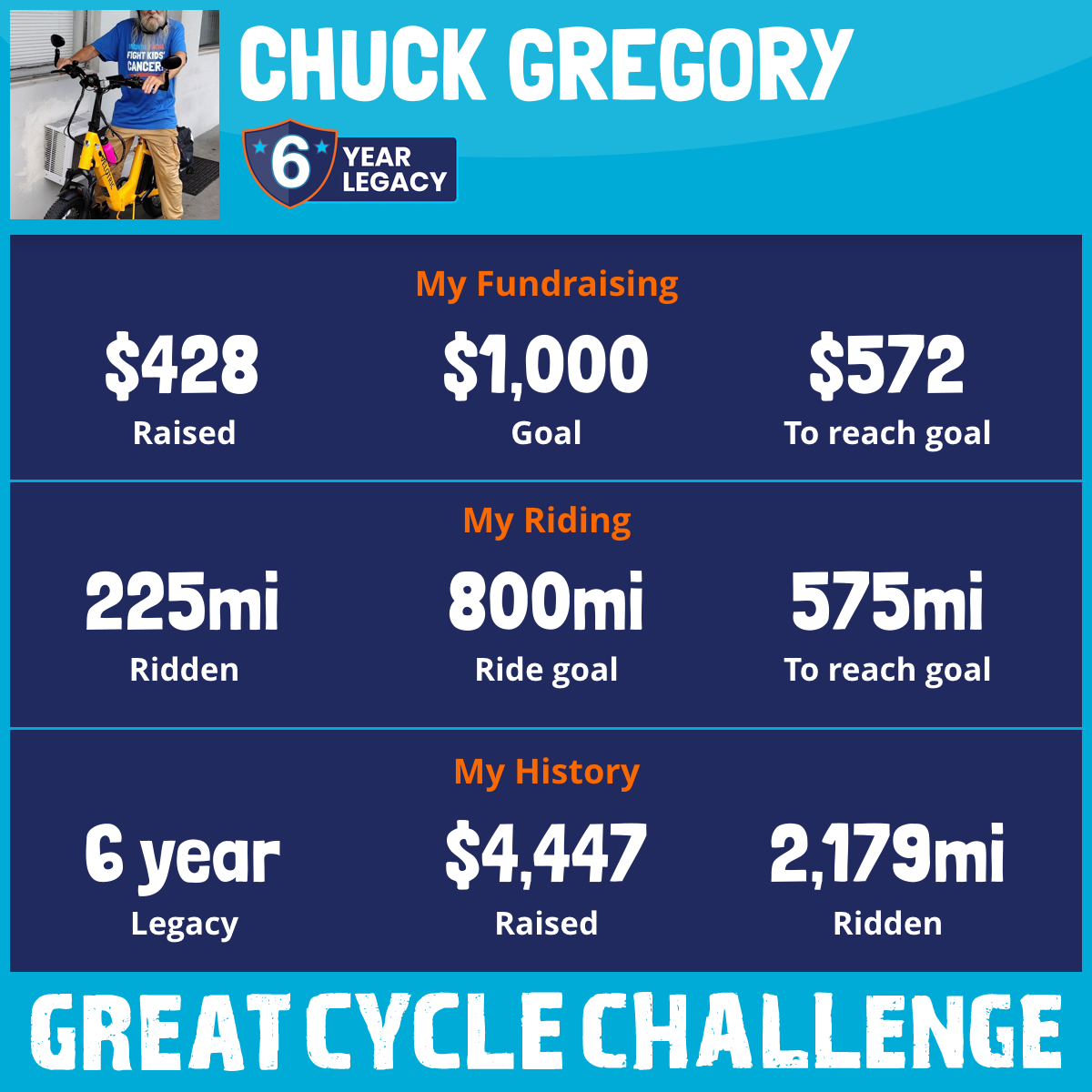 This September, for the sixth year in a row, I am taking part in the Great Cycle Challenge to fight kids' cancer! I'm going to ride at least 800 miles (I do have electric assist, but I'm no spring chicken) and I have set a fundraising goal of $1000.