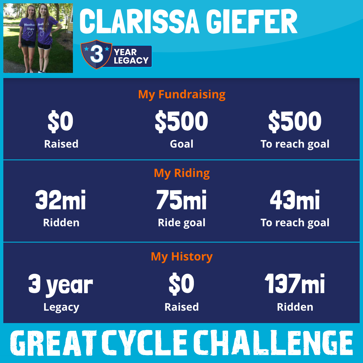I am riding 75 mi in memory of Heather Giefer. Please sponsor me and support my challenge to fight kids' cancer and save little lives.