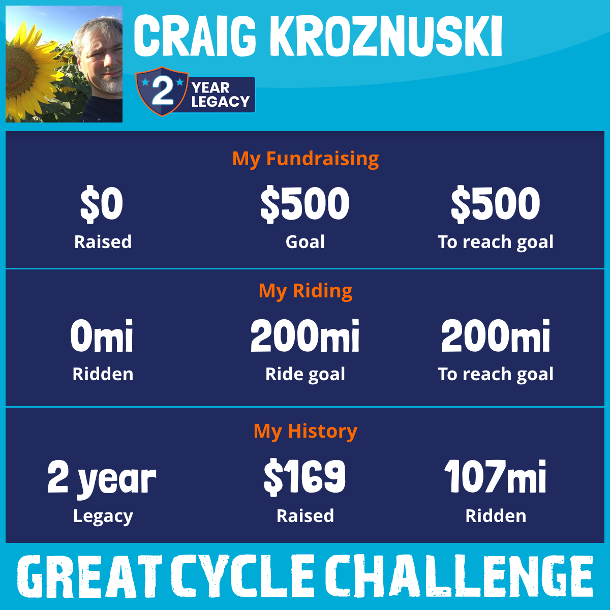 I am riding 200 mi in memory of Ron Kroznuski and Eva Bowers. Please sponsor me and support my challenge to fight kids' cancer and save little lives.