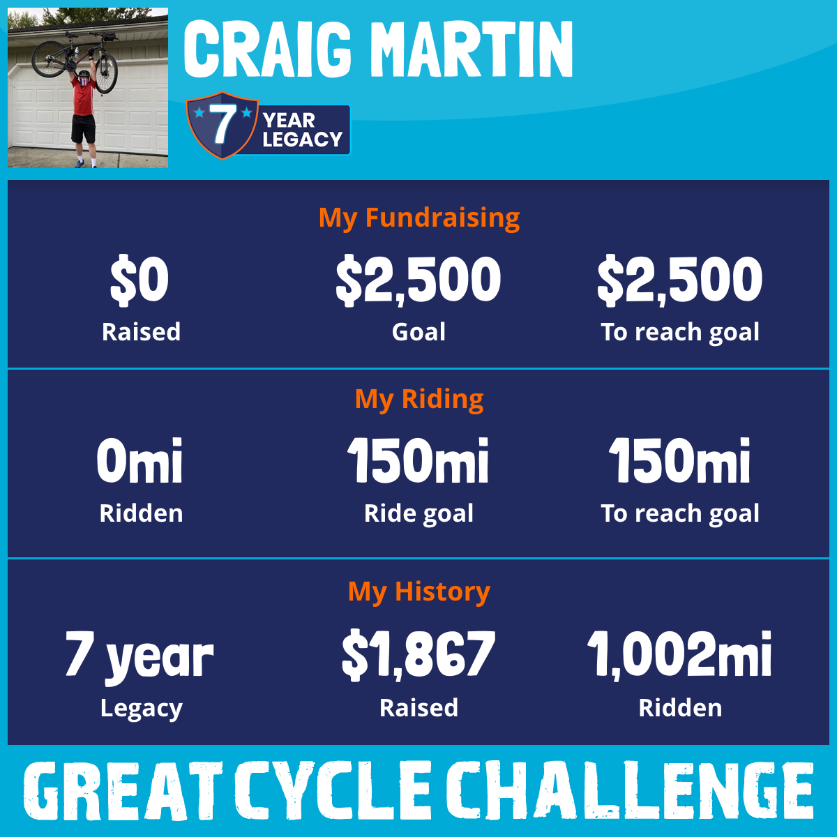 I am riding 150 mi for Dean Martin. Please sponsor me and support my challenge to fight kids' cancer and save little lives.
