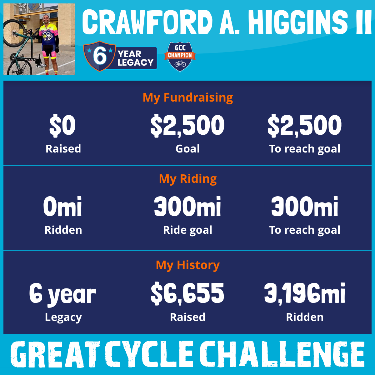 I've raised $0 My goal is $2,500 Donate Now