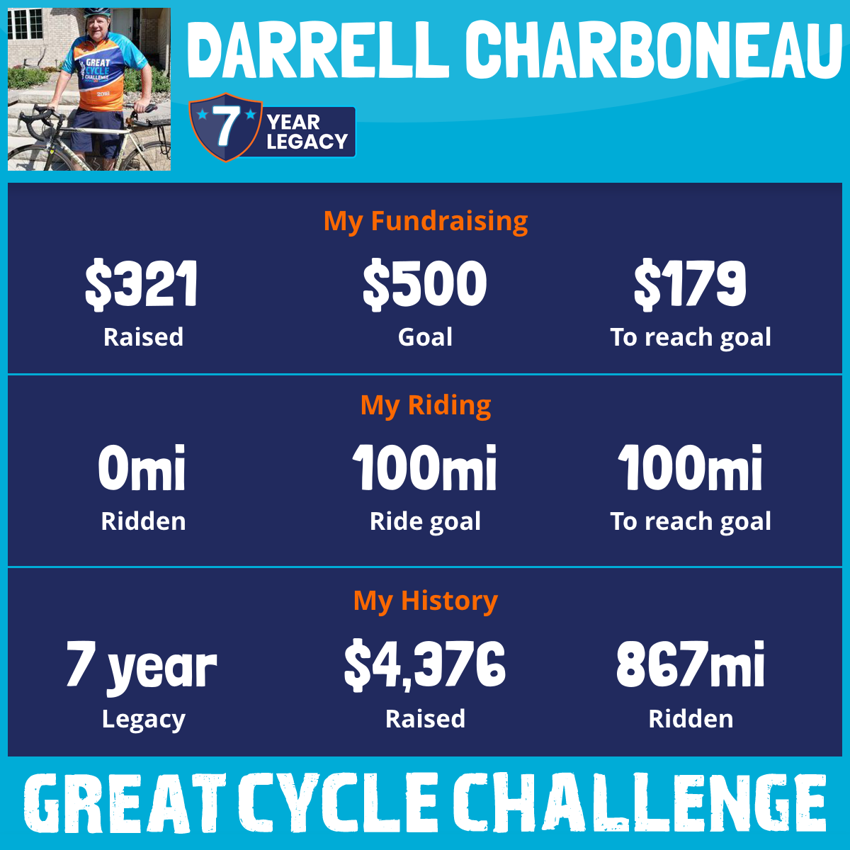 This September, I am taking part in the Great Cycle Challenge to fight kids' cancer! I am also riding for myself. My cancer journey started 5 years ago. I am on daily cancer drugs, and my tumor and cancer are stable at this time. I had a hard time finishing my goal last year, but thankfully I am here to try achieve my 100 mile goal this year. I have been doing physical therapy to try regain strength to ride this year. This is my 7th year riding the GCC challenge. I just take one day, one month, one year at a time.