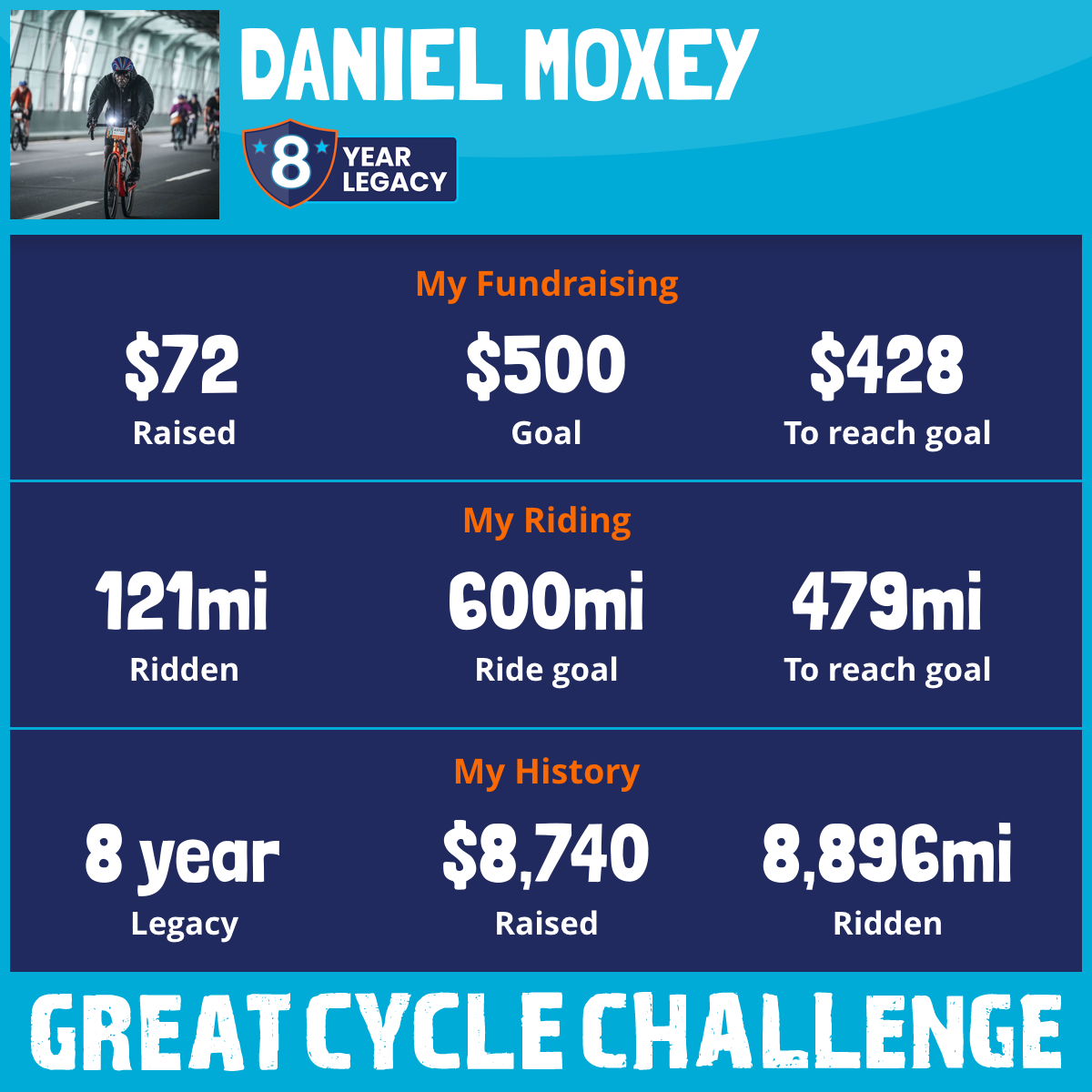 Check out my dashboard :https://greatcyclechallenge.com/Riders/DanielMoxey