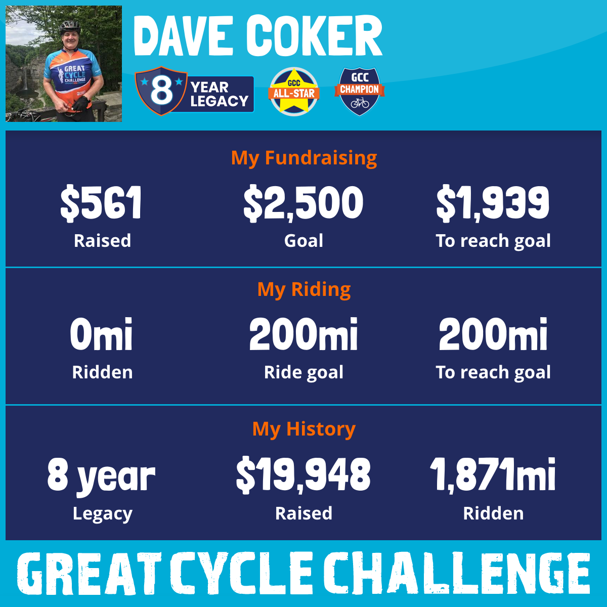 This is my 8th year and just like the last few years, this September 2025 I’m taking part in the Great Cycle Challenge to fight kids' cancer! This year I am going to push to 200 miles and we are going to stretch our financial goal a bit to $2500.