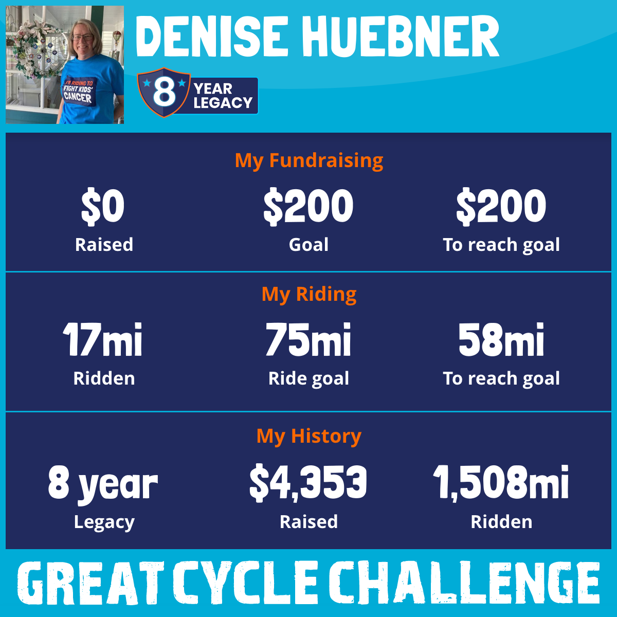 This year the government choose to reduce funding for pediatric cancer. So I’m back riding again for my 8th year. Please support me by donating on Wednesday 9/10 when special donors provide funds to match all donations that day. TY
