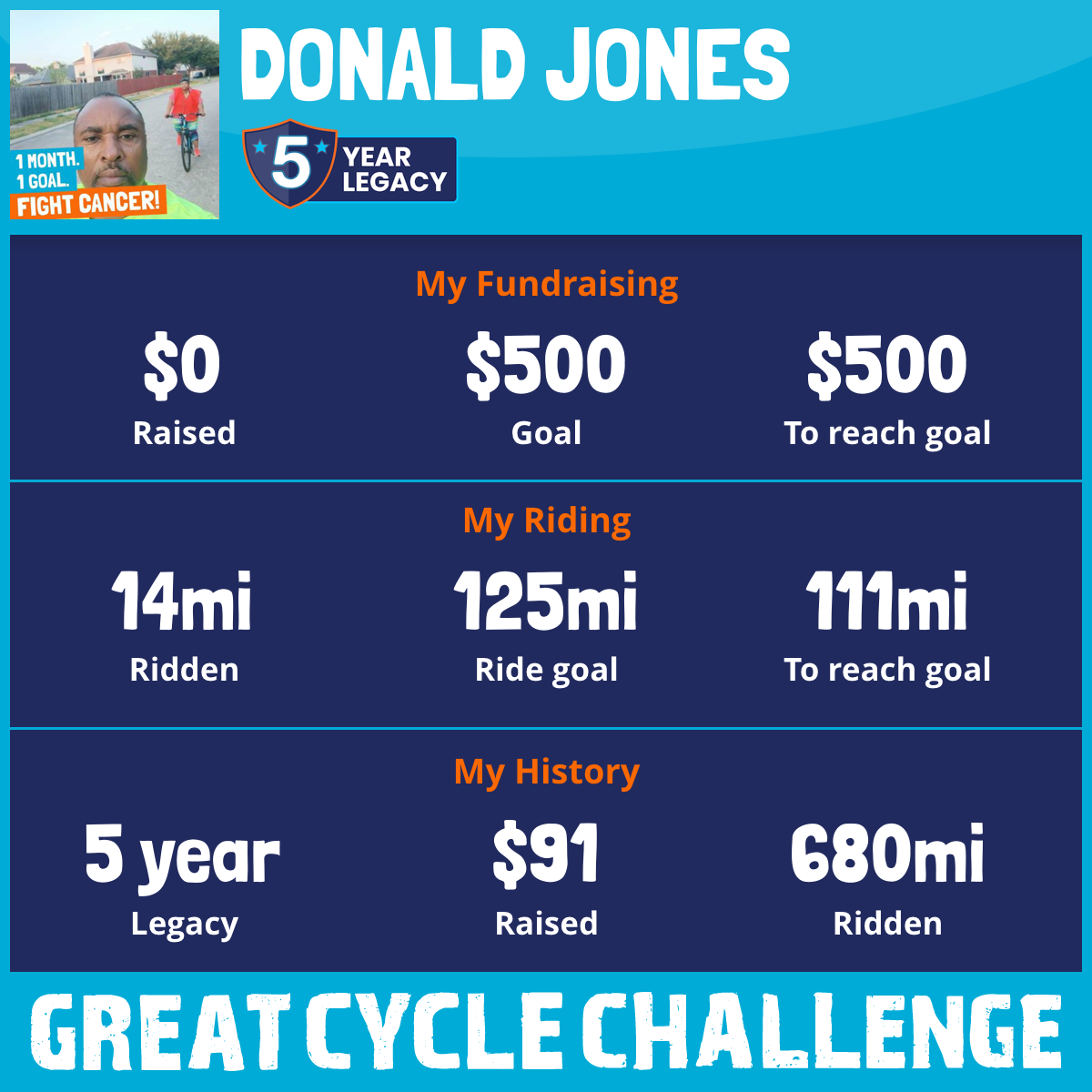 I am riding 125 mi for Sharon Jones(wife). Please sponsor me and support my challenge to fight kids' cancer and save little lives.