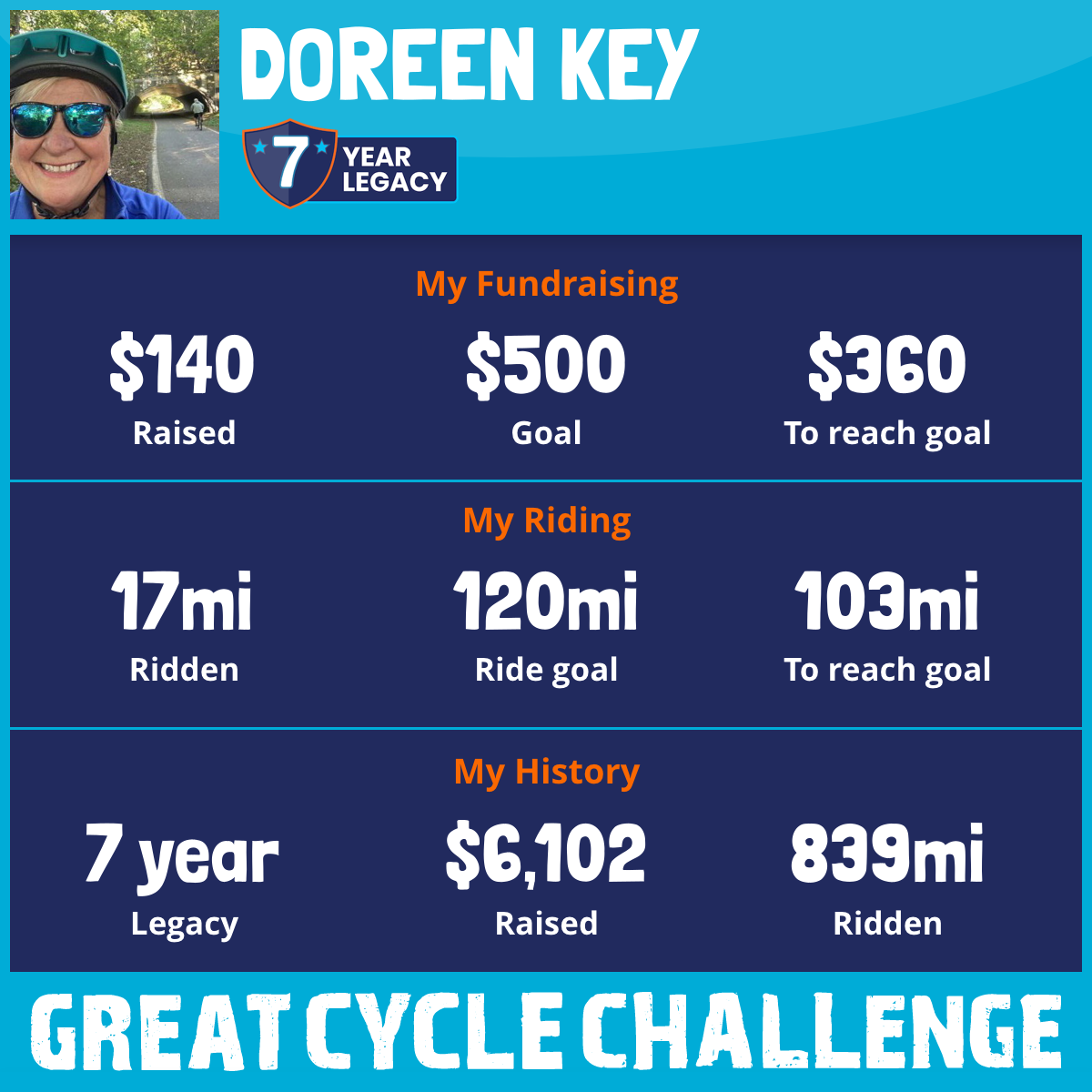 I'm riding in honor of my sister, Diane, who lost her battle with cancer in April, 2020. Not a day goes by that I don’t think of her and her bravery throughout those 9 years. We all miss her so much! ❤️
