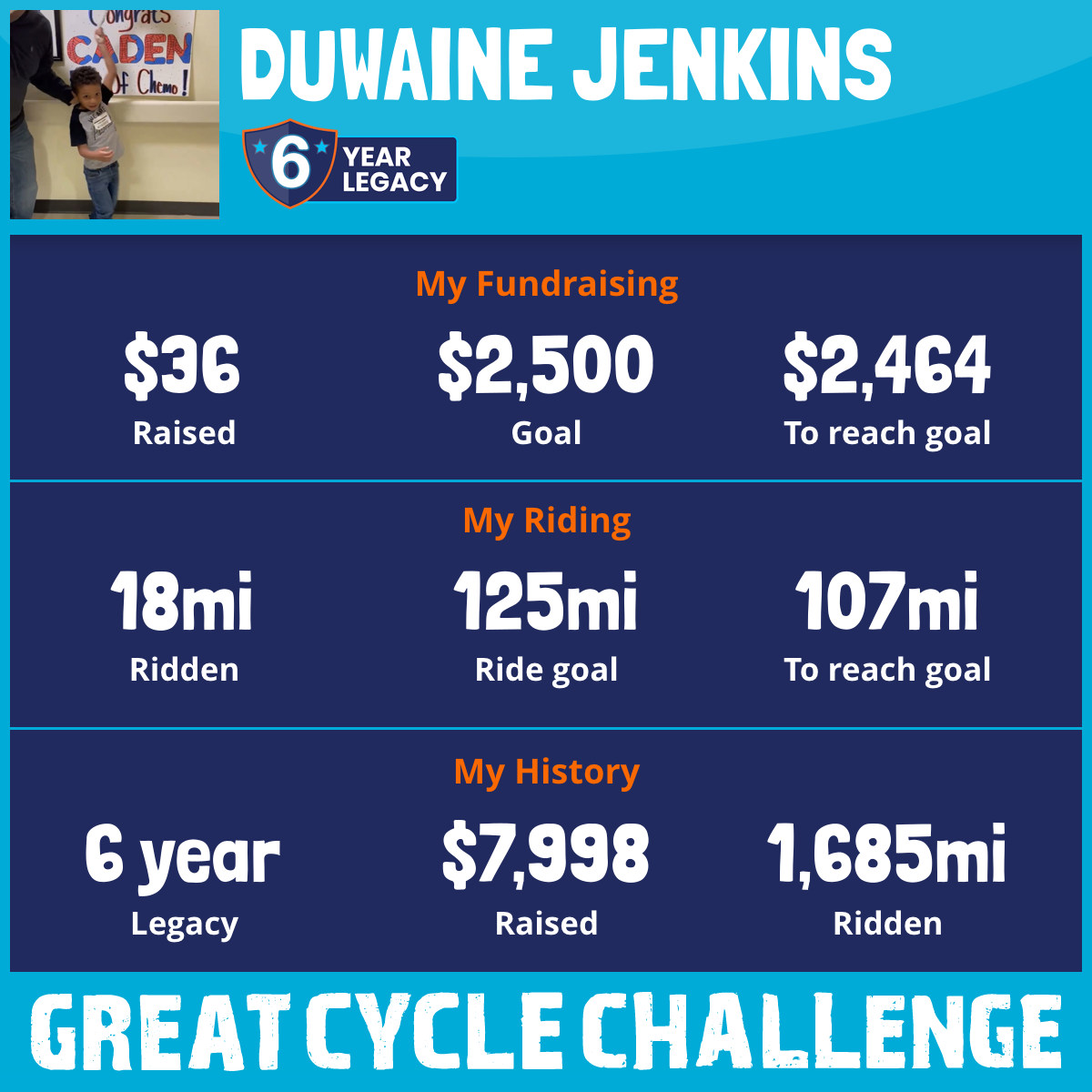 Hello! Thanks for thinking of Caden again. Caden has rung the bell! There's still so much more to do. He’s starting 3rd Grade this year! He's enjoying being outdoors, going to Natural Science Center here in Greensboro. We’re truly thankful that he’s thriving and enjoying being a kid to the fullest! Thank you for riding on behalf of our son and your continued support for Pediatric cancer research.