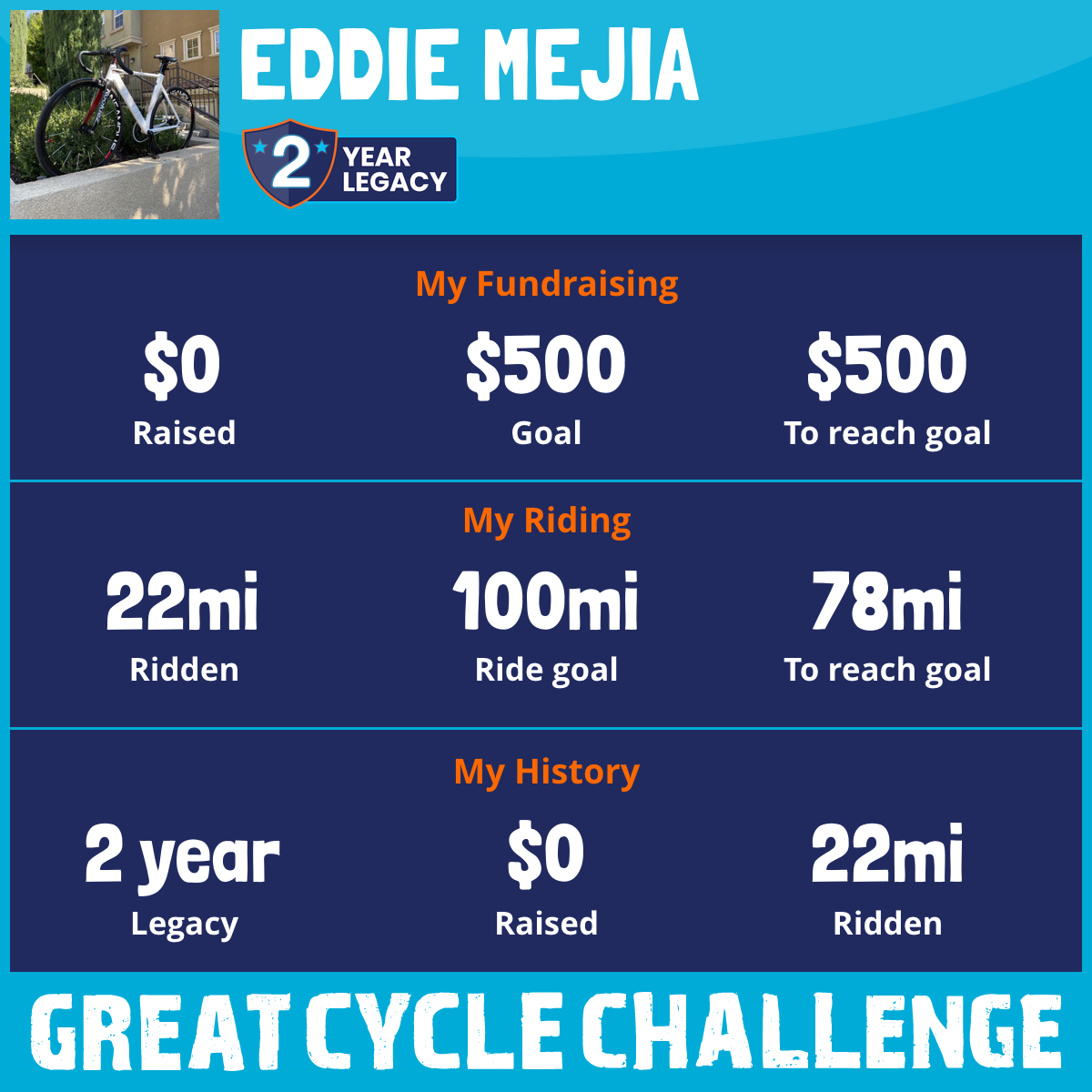 I am riding 100 mi for my cousin, Rafael. Please sponsor me and support my challenge to fight kids' cancer and save little lives.