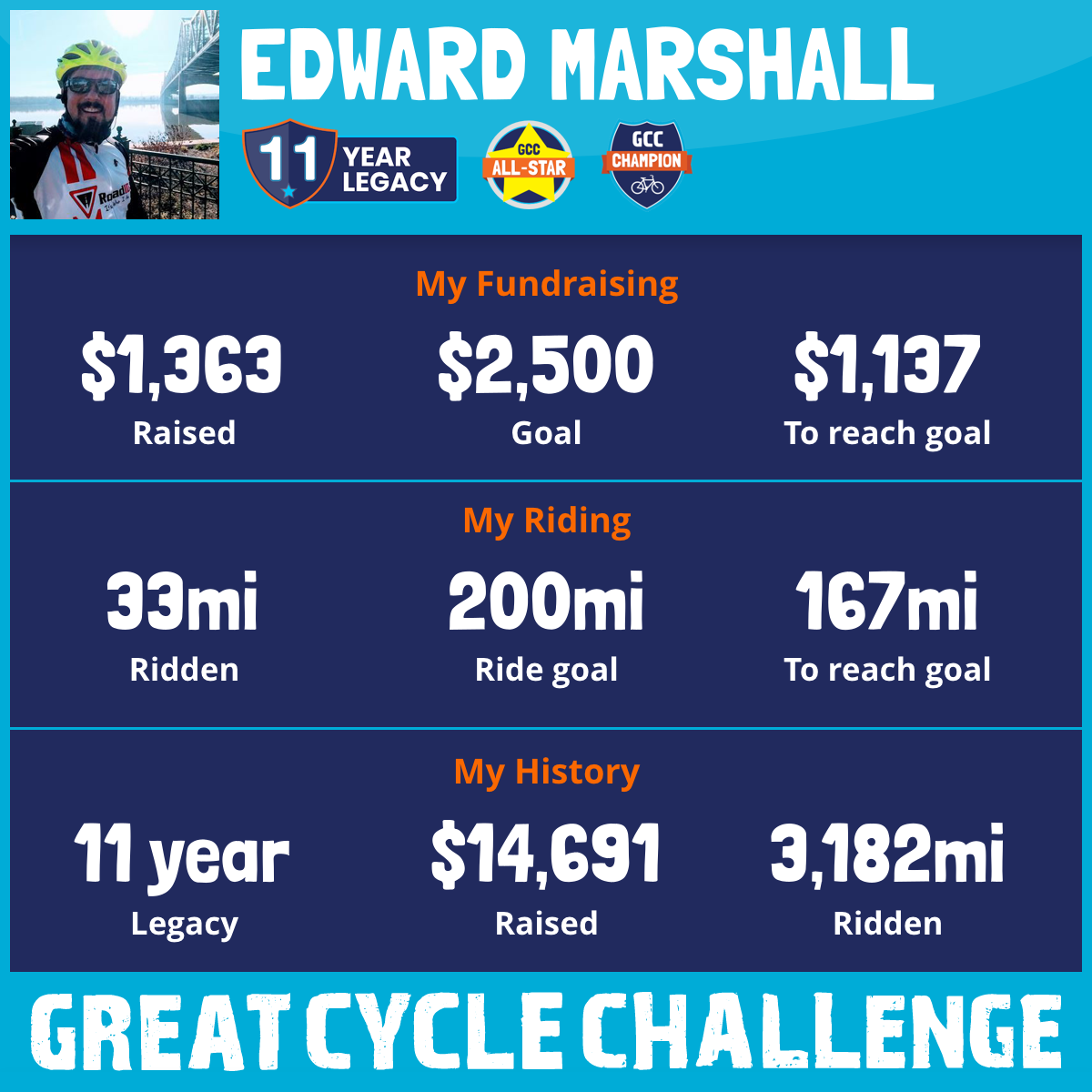 Please support my challenge now to end childhood cancer and save little lives. Or come join me for a ride! To make a donation, view my fundraising page: www.greatcyclechallenge.com/Riders/EdwardMarshall
