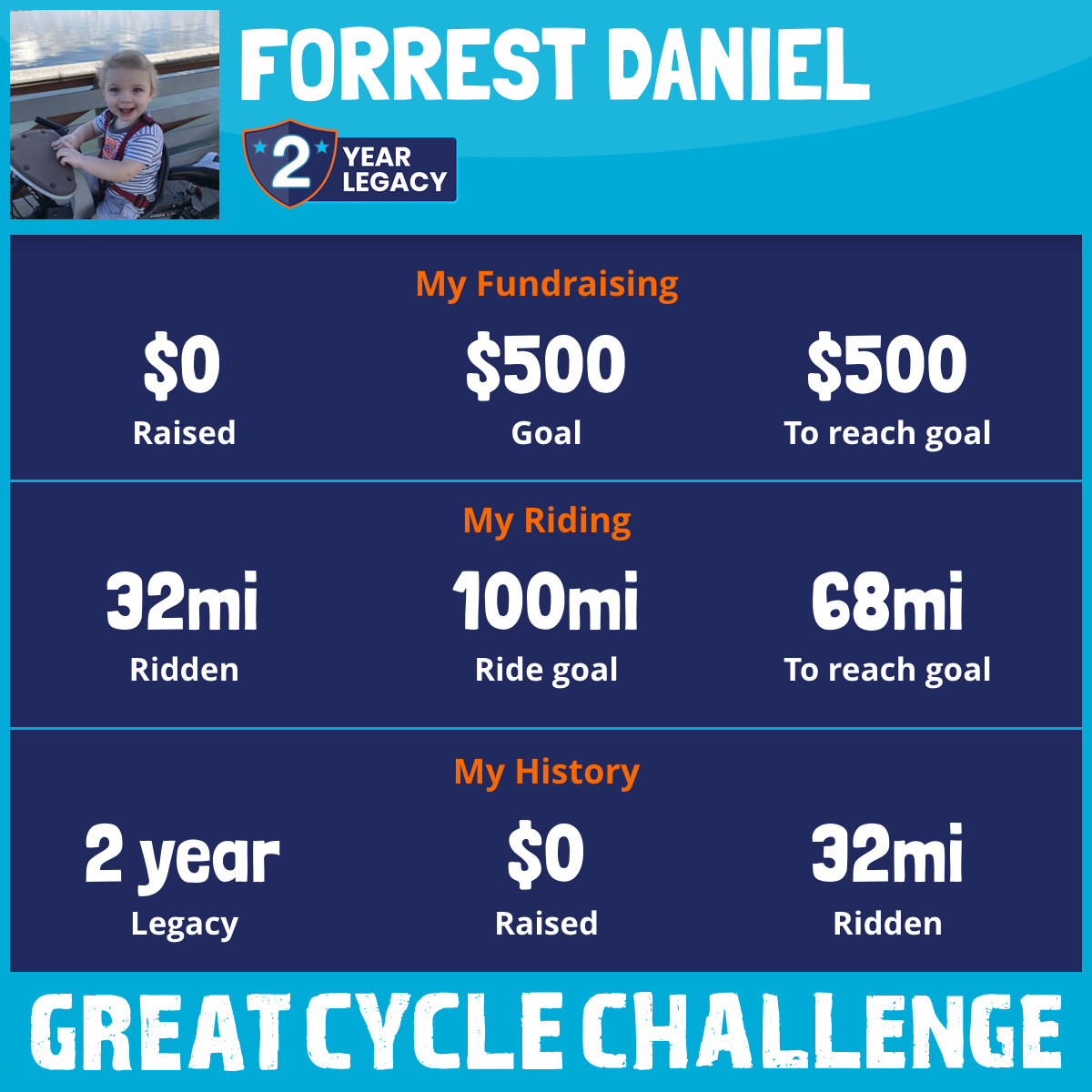 I am riding 100 mi for my son, Mason. Please sponsor me and support my challenge to fight kids' cancer and save little lives.