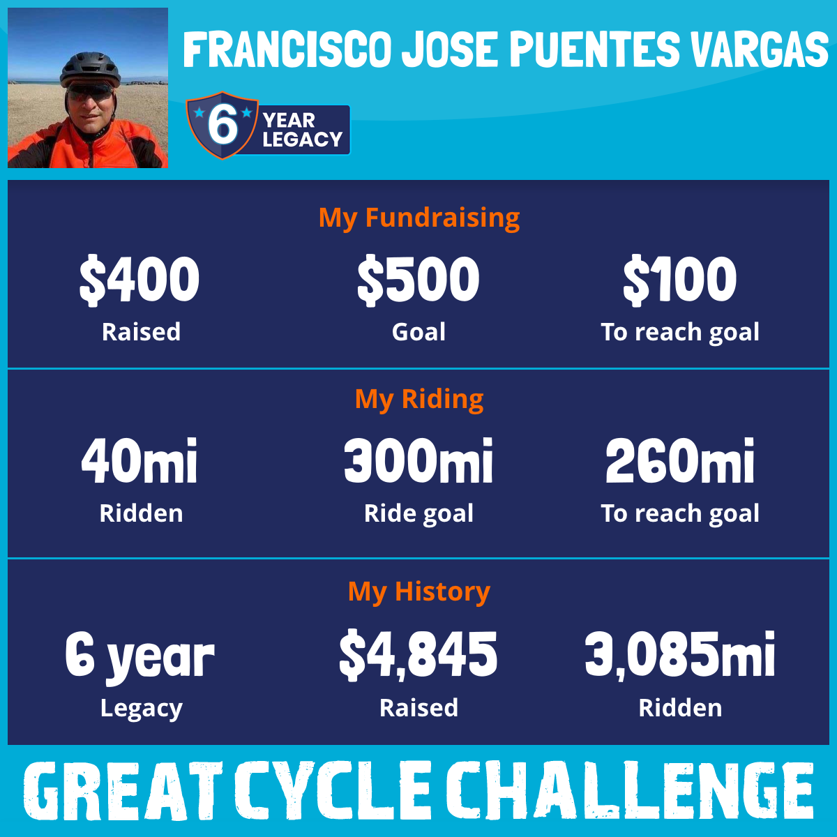 I am riding 300 mi in memory of Francisco Puentes Centeno. Please sponsor me and support my challenge to fight kids' cancer and save little lives.