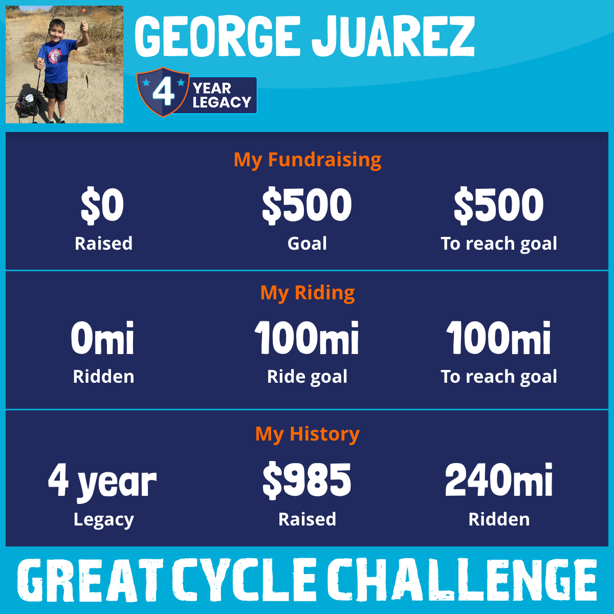 I am riding 100 mi for my son, Jonathan Juarez. Please sponsor me and support my challenge to fight kids' cancer and save little lives.