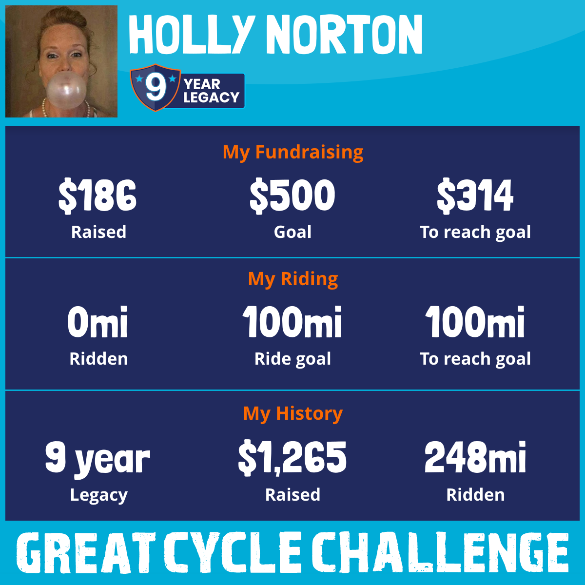 24 Jun 2025September 1 kicks off my 9th year with Great Cycle Challenge!! I am ready! Keep up with my progress on Facebook and cheer me on and, if you feel compelled, donate to the cause.