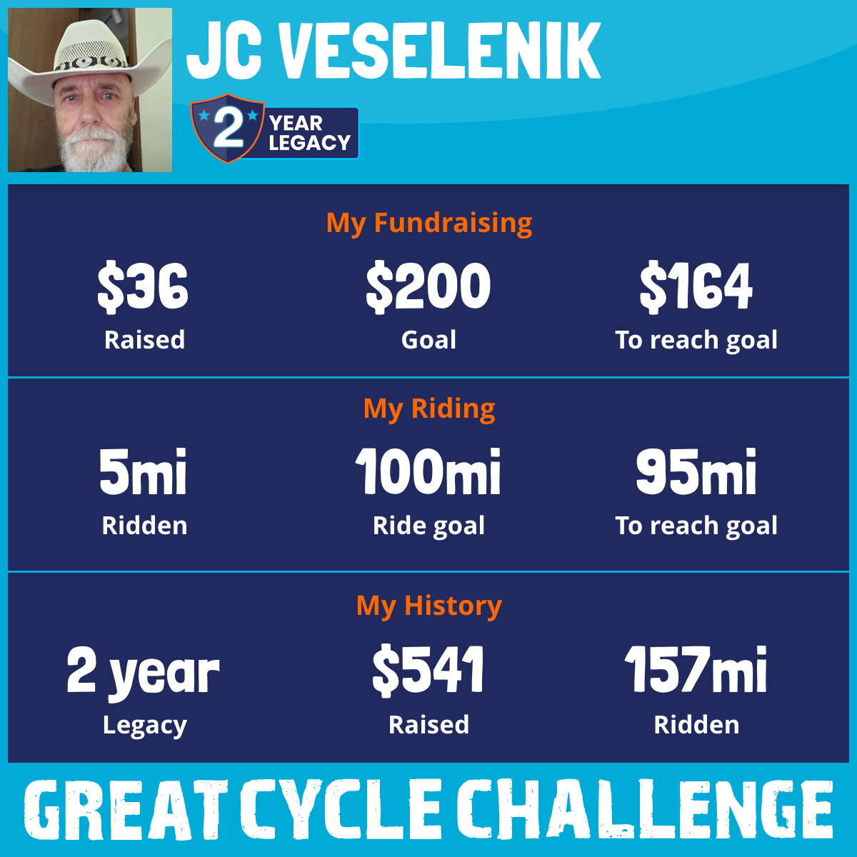 I am riding 100 mi for JC. Please sponsor me and support my challenge to fight kids' cancer and save little lives.