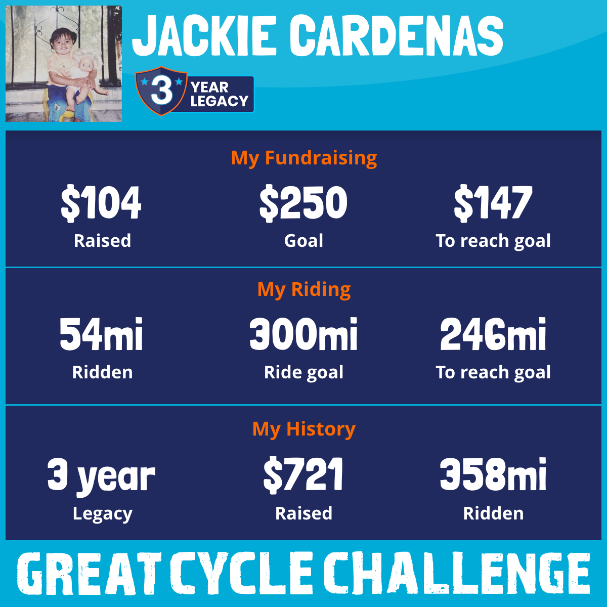 I am riding 300 miles in memory of my cousin Rosita. Please sponsor me & support my challenge to fight kids cancer and save lives. Thank you for the support!
