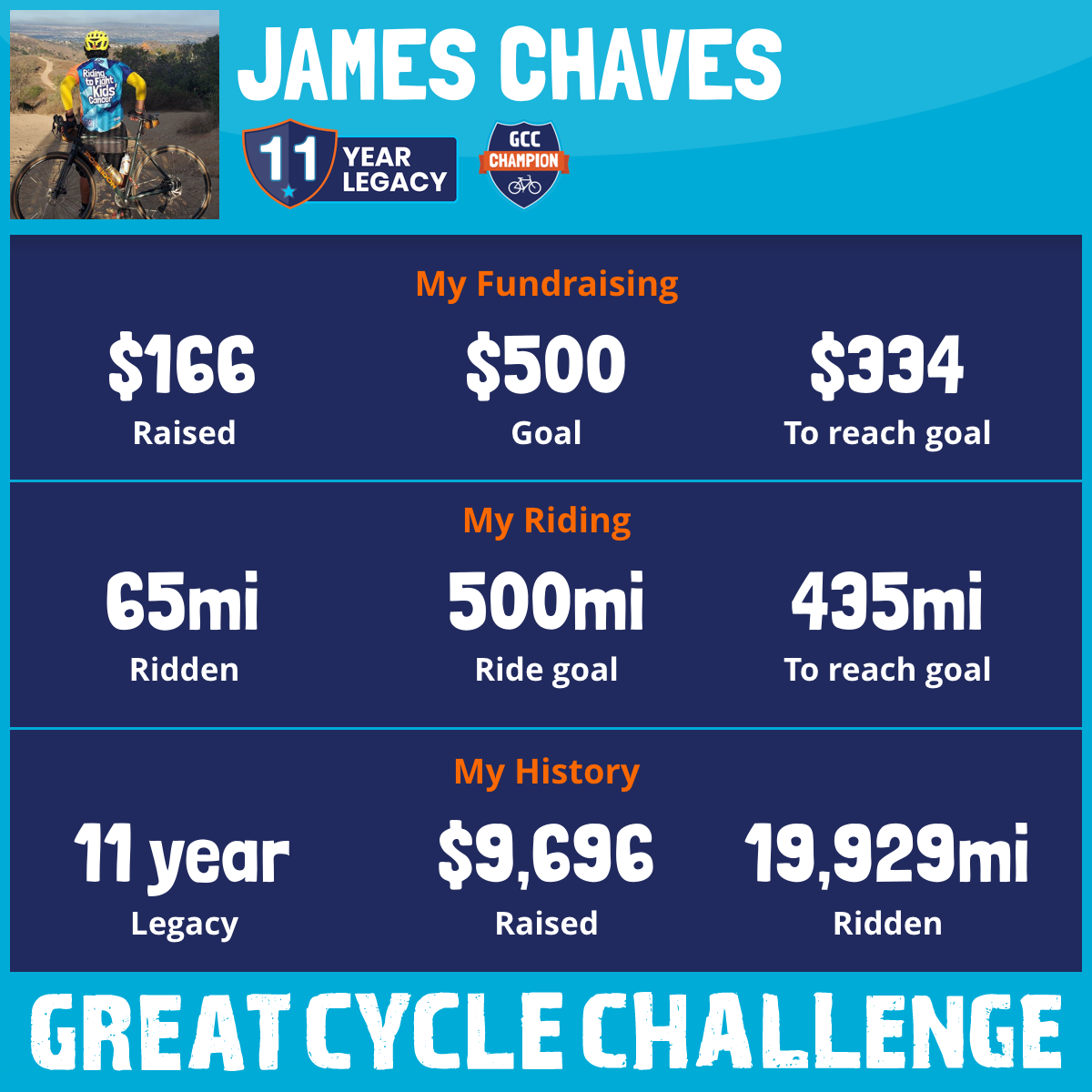 This will be my 11th year riding for this great cause. I'm very proud of our #TeamCaliforniaLove I ride for the warriors battling cancer, the survivors, and in memory of our loved ones that passed away. Cancer doesn't take a break and neither will I until a cure is found. My goal is simple: I will ride a mile per dollar you donate. Thank you for all your support.