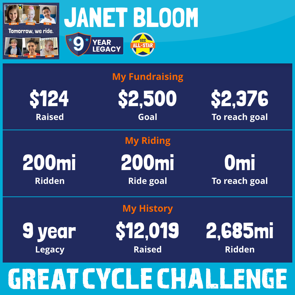 I am riding 200 mi in memory of Elaine Johnson Eck. Please sponsor me and support my challenge to fight kids' cancer and save little lives.