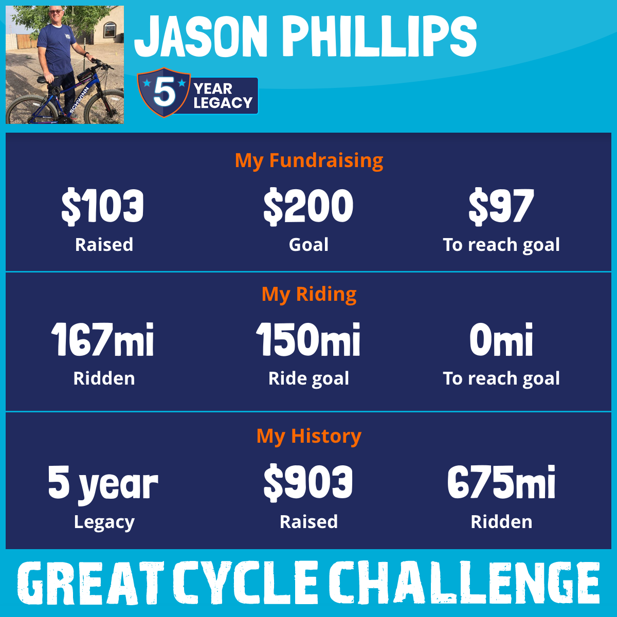 This will be my second year participating in the Great Cycle Challenge. Last year I was able to exceed my riding and donations goal and I look forward to crushing this years goal. I appreciate all the support I received last year from donations to the kind and encouraging words.
