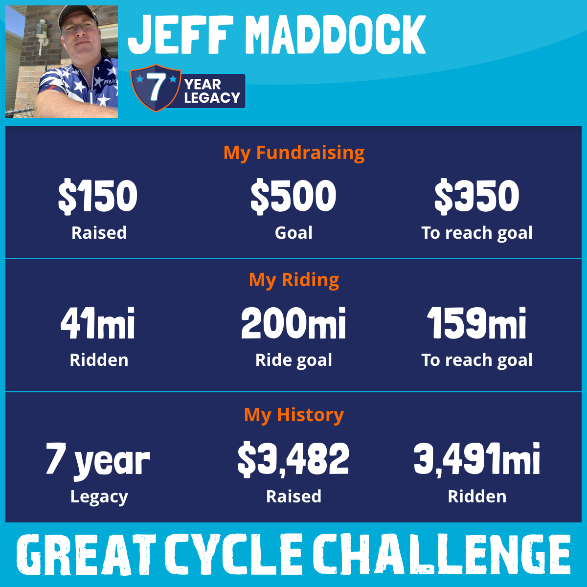 I am riding 200 mi for Jeff Maddock. Please sponsor me and support my challenge to fight kids' cancer and save little lives.