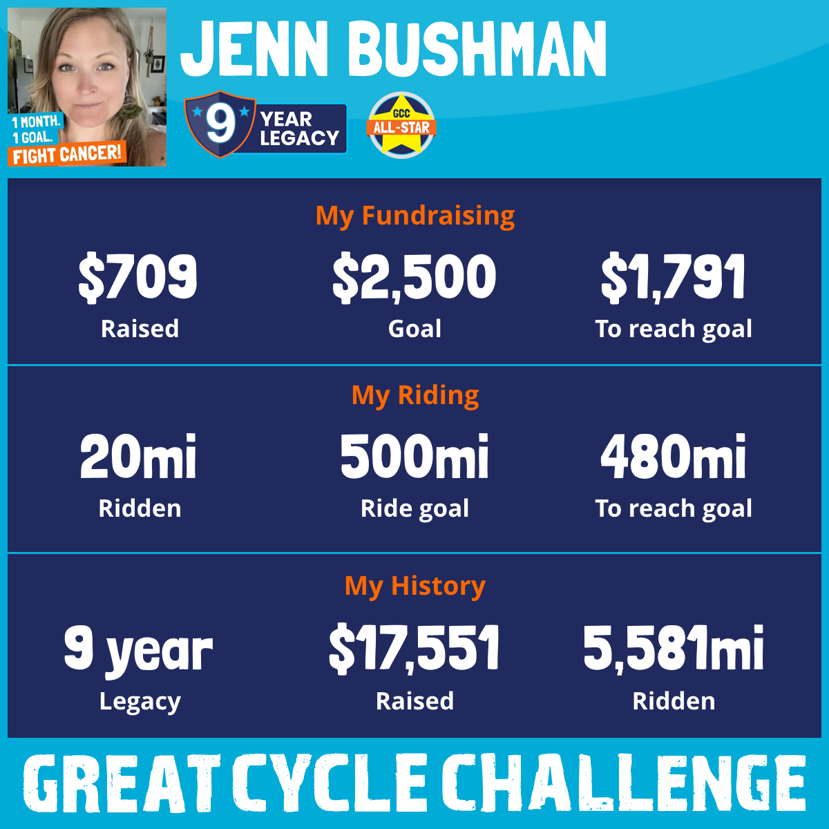 If I hit my fundraising goal of $2500, I'll post my last ride wearing my GCC Allstar Jersey! This challenge will be grueling, but it's nothing compared to what these brave kids and their families face every day of their lives as they battle cancer.