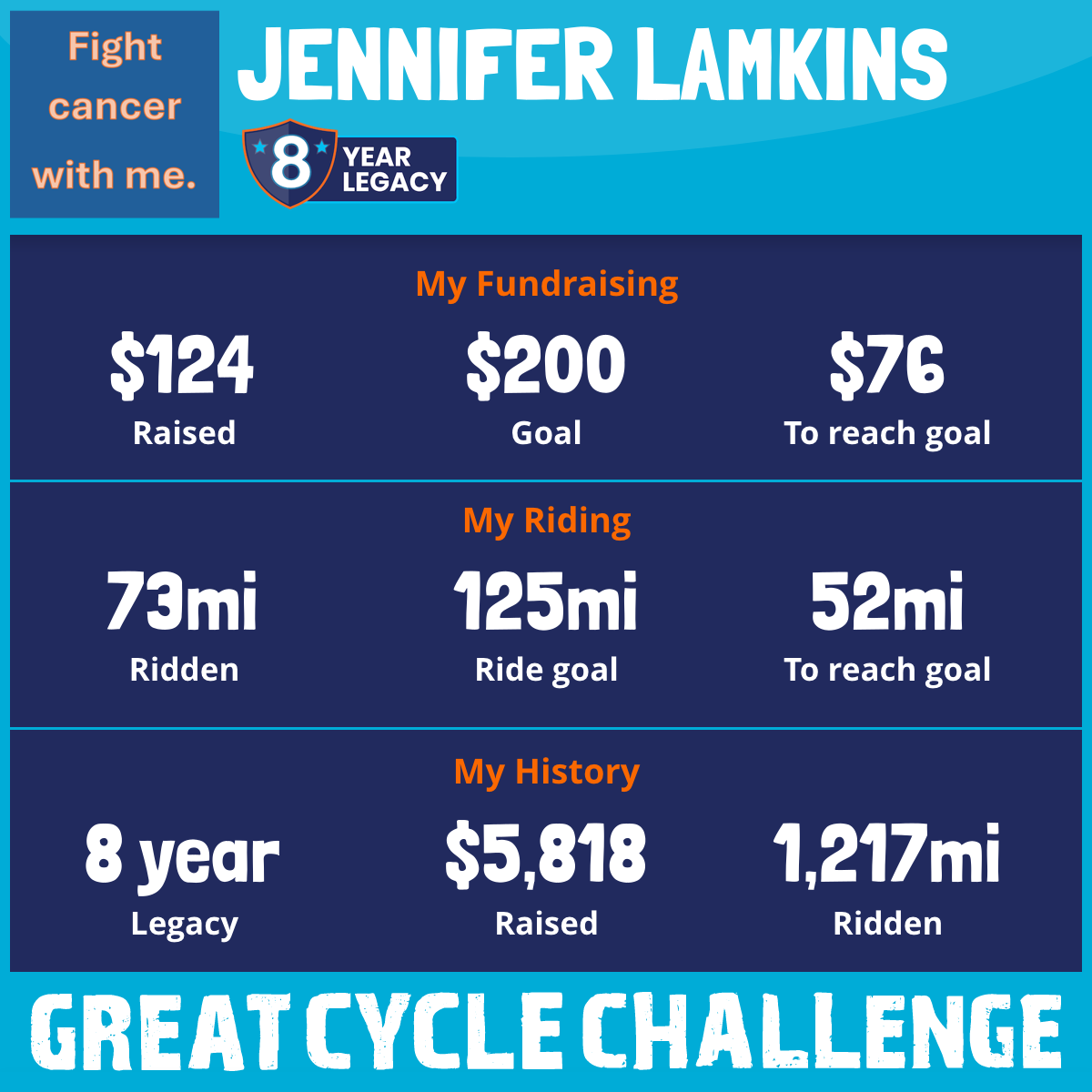 I ride in memory of Molly Cahill and my brother, Mark, both lost to cancer. I ride in honor of my dad, George Lamkins, and my cousin, Molly Glynn, who both enjoyed cycling and passed away during the month of September. I in support of my neighbor who is in yet another battle with a rare form of cancer. I bring all of their spirits with me on this journey.