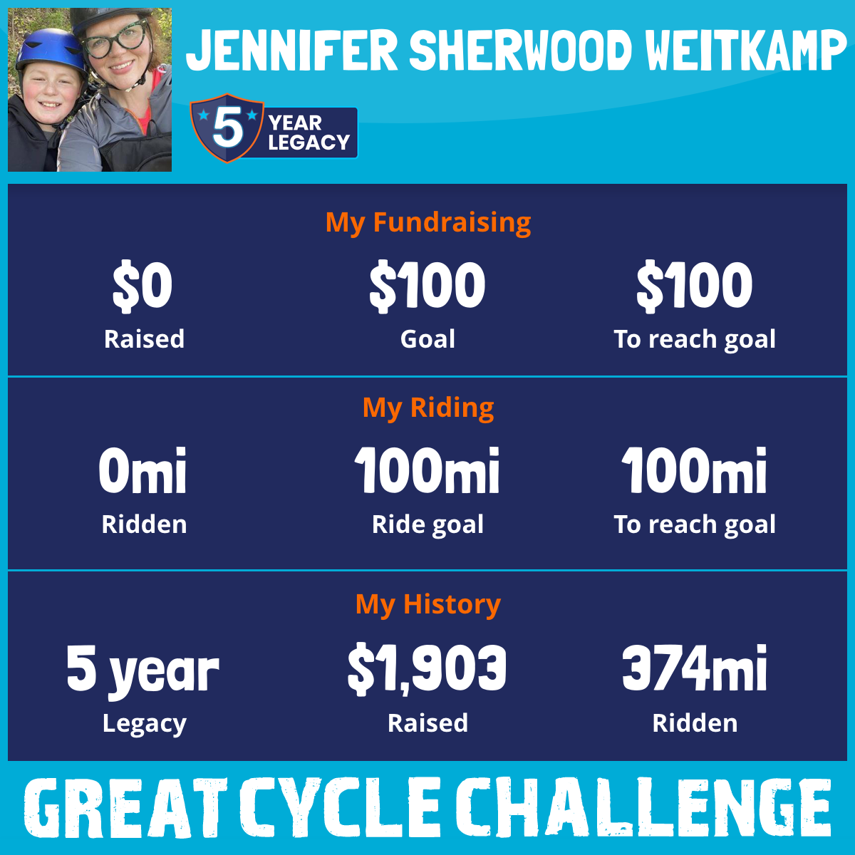 I am riding 100 mi in memory of Jean Sherwood. Please sponsor me and support my challenge to fight kids' cancer and save little lives.