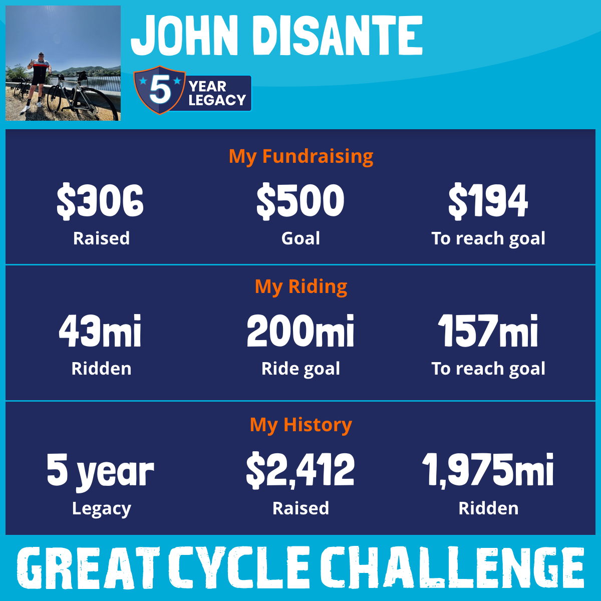 I am riding 200 mi for Joe DiSante. Please sponsor me and support my challenge to fight kids' cancer and save little lives.
